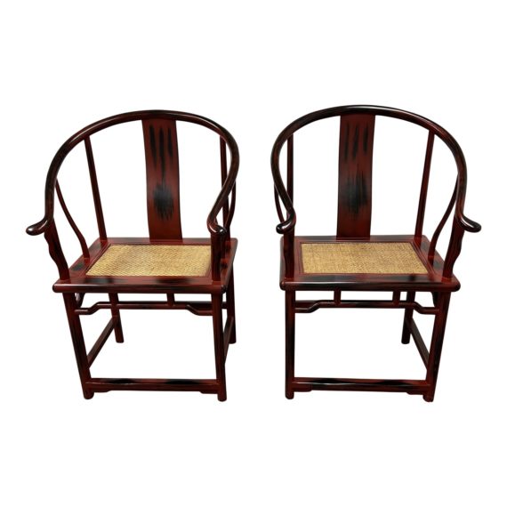 Design Plus Gallery presents a Pair of Vintage Ming Style Distressed Wood Horseshoe Chairs. Known as quanyi circular chair, these horseshoe-back style chairs derive from chairs made of pliable lengths of bamboo, bent into a “U”-shape. These chairs display the ingenuity of Ming dynasty cabinet makers, who were able to create a hardwood version by developing complicated joinery techniques. These chairs owe their aesthetic appeal to the fluid movement created by their continuous crest rail, which provides a sense of containment and ease to their occupants. Comfortable, sturdy and lightweight, horseshoe-back chairs were highly popular in the Ming and Qing dynasties, and were frequently depicted in contemporary woodblock illustrated books. In ancient China, quanyi was used for either the master of the house or important guests who were close to the family. wear on cane seating shown by darkened discoloration. In good vintage condition, wear consistent with age + use.