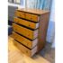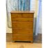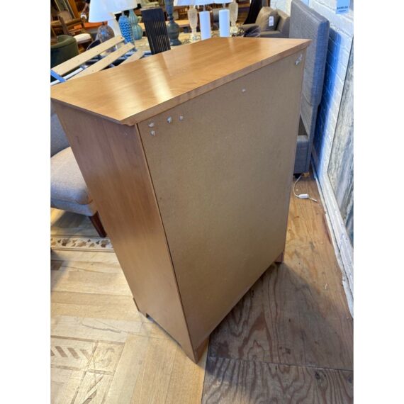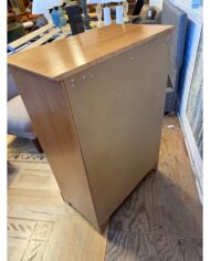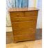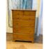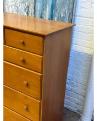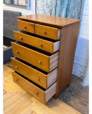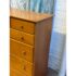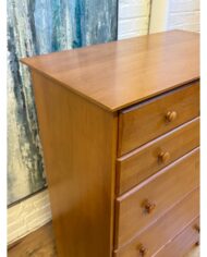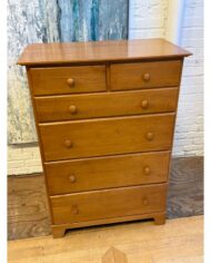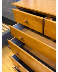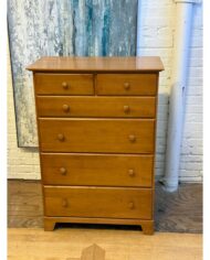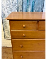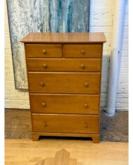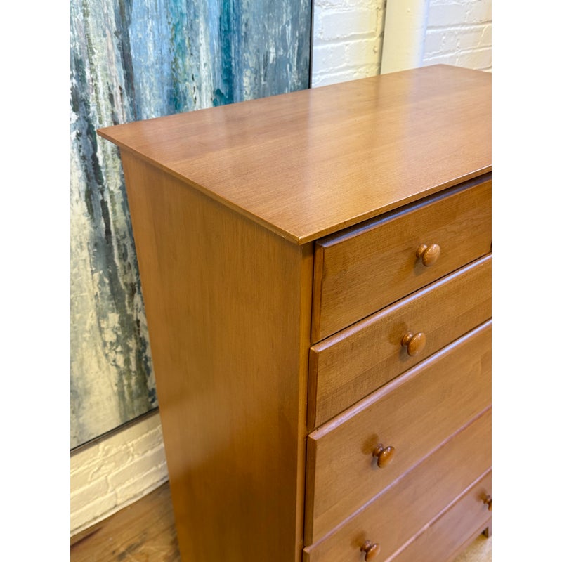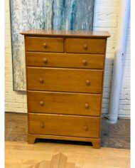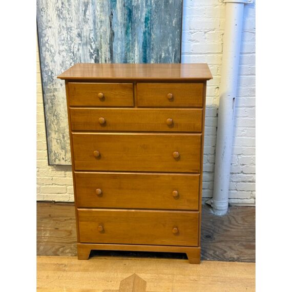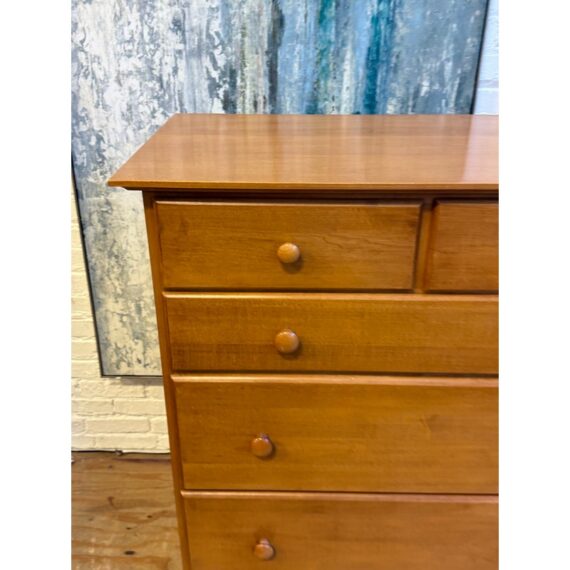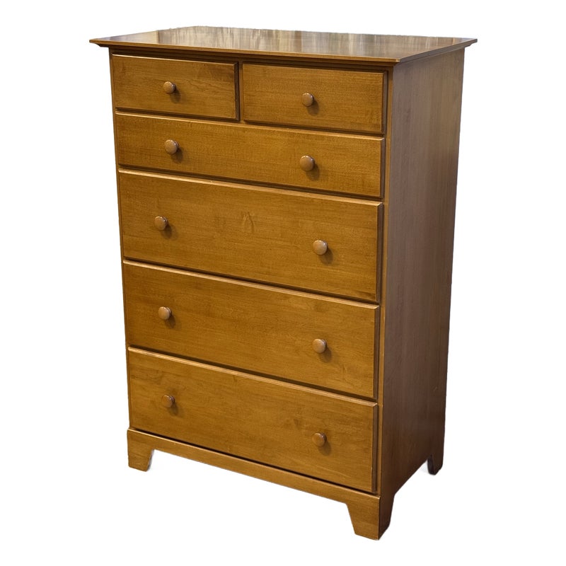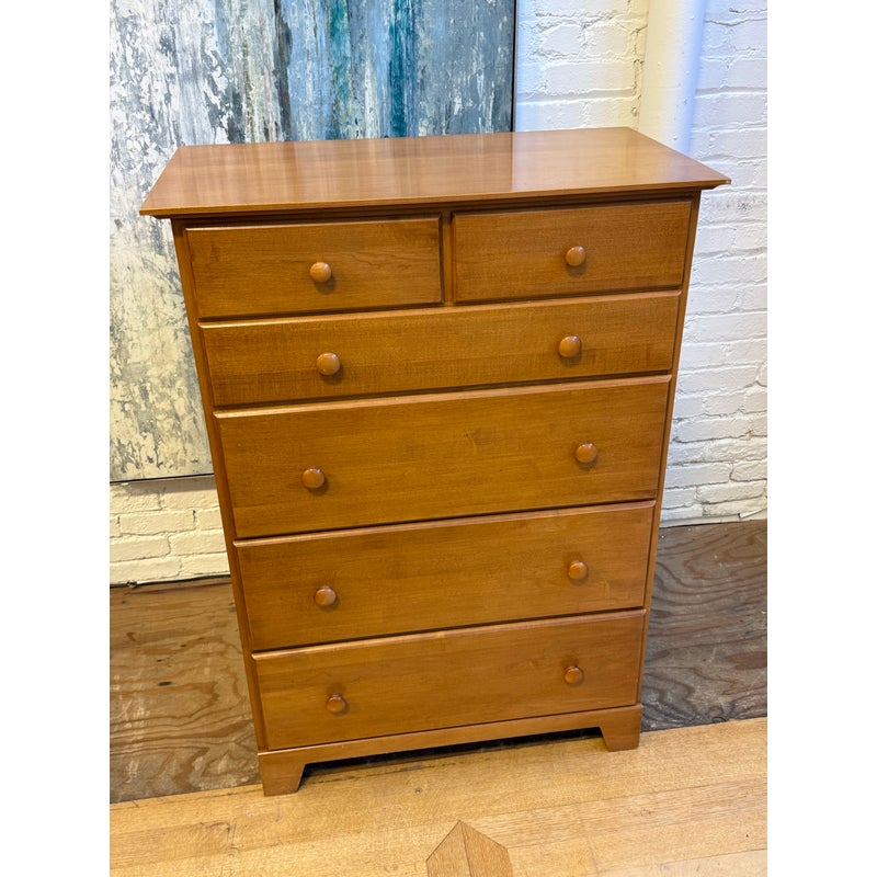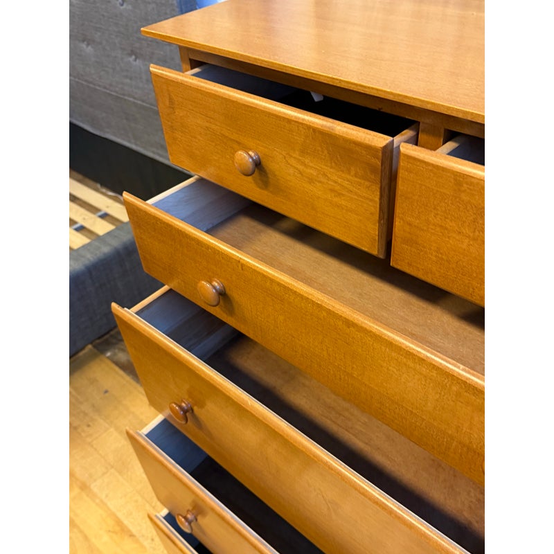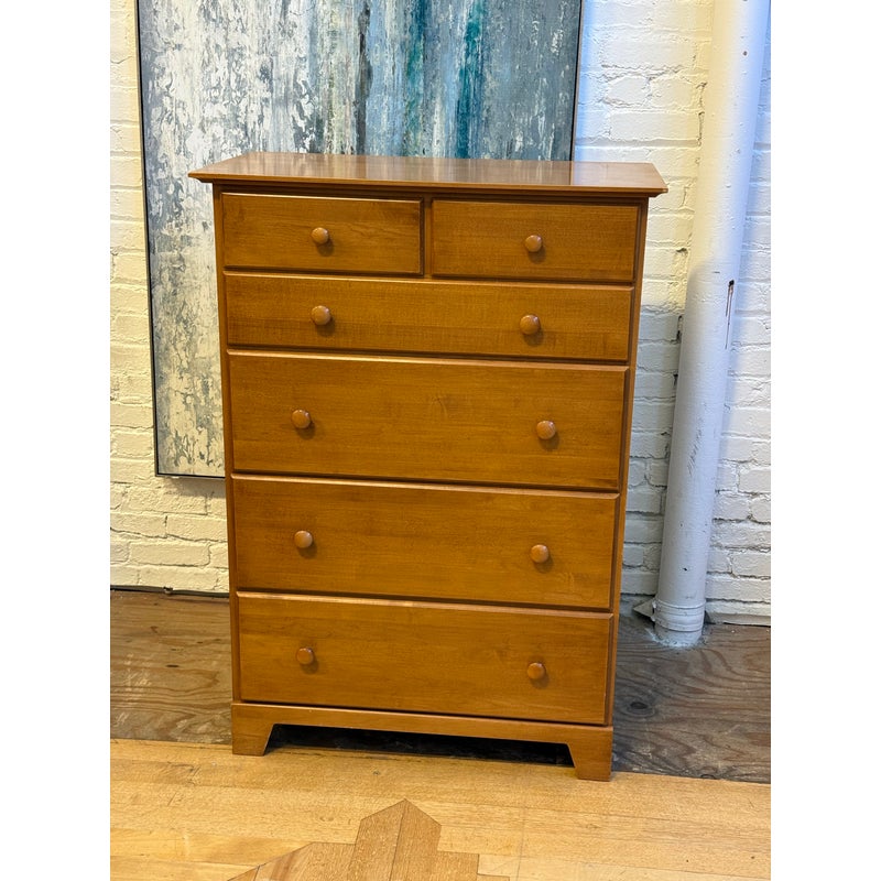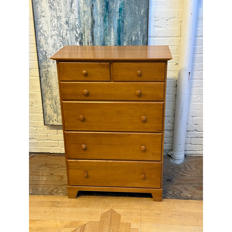 Design Plus Gallery presents a Honey Brown Finish High Boy Dresser from Moosehead Furniture. The dresser is from the late 20th Century and has traditional near shaker style characteristics. All six drawers have identical button knobs that are in the same finish of honey brown. The entire dresser is crafted from wood in Maine, with brand stamp on the inside of drawer. Is in good condition for its usage.