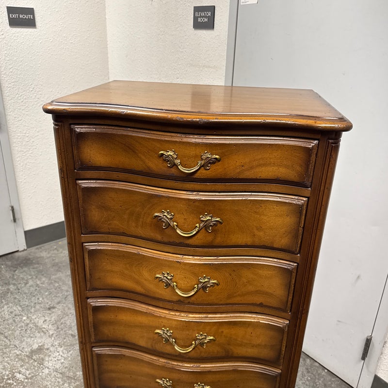 Design Plus Gallery presents a Dresser from Dixon-Powdermaker. The dresser was crafted in Jacksonville, Florida by the renowned N.A.F.M. (National Association for Furniture Makers) and showcases mid-century craftsmanship with authentic French-inspired details. The dresser has cabriole legs that lend to its graceful and airy stance that is omnipresent to French provincial design. Each of the seven drawers is adorned with also French-inspired metal handles that provide a striking accent against the warm, walnut-finished wood. Visible wear and patina throughout the finish speak to its genuine mid-century origin. In good vintage condition. Made in USA.