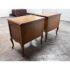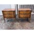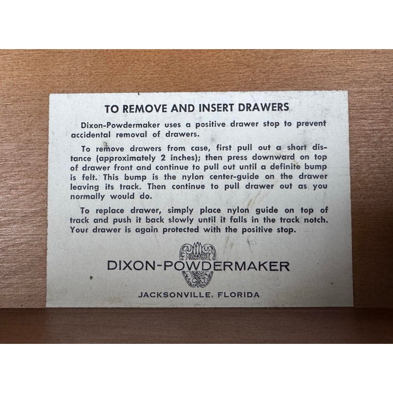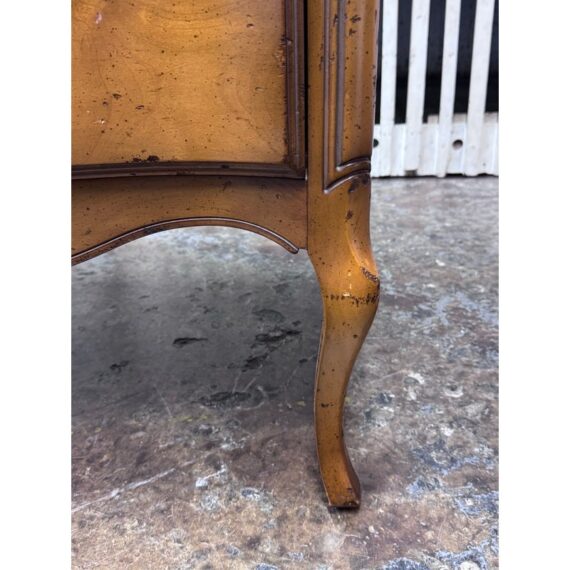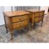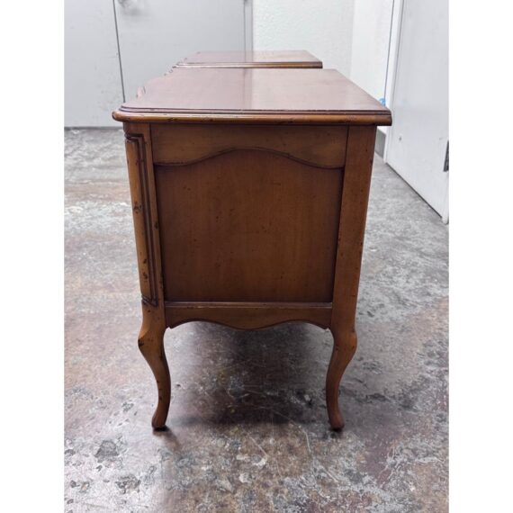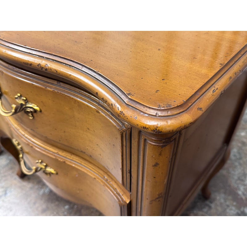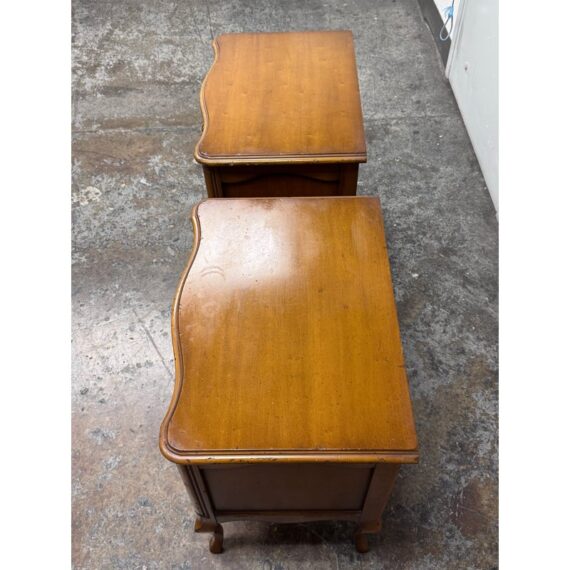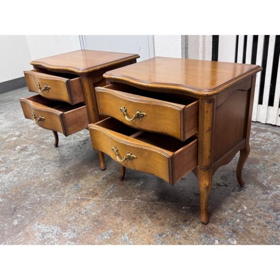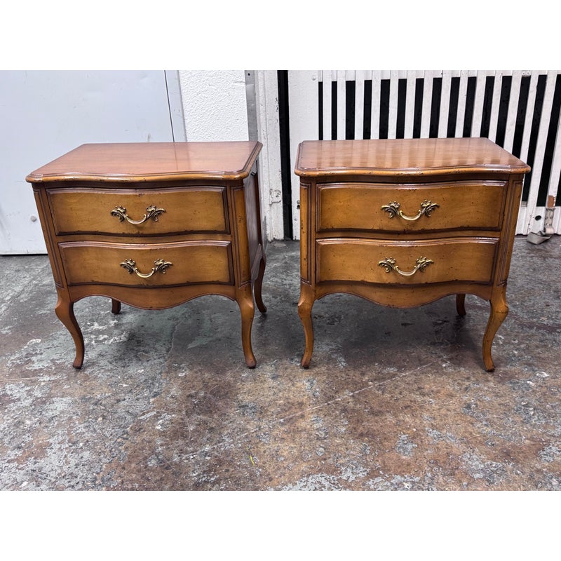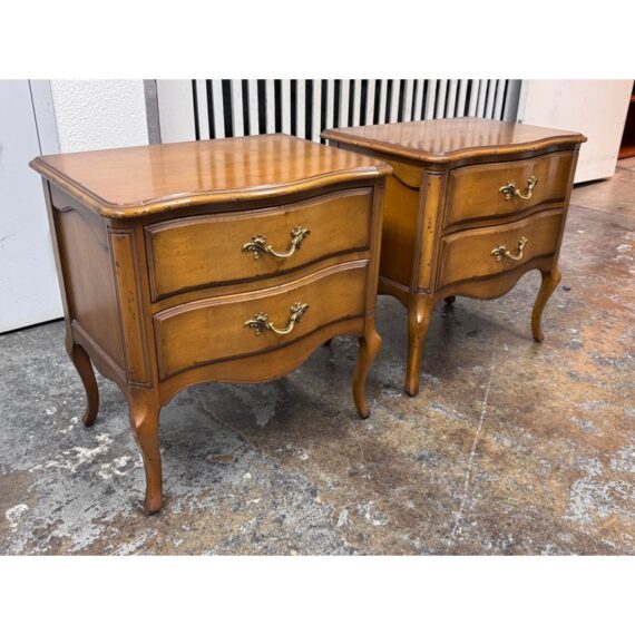 Design Plus Gallery presents a Pair of French Nightstands by Dixon PowderMaker. Crafted in Jacksonville, Florida, by the renowned N.A.F.M. (National Association for Furniture Makers), these nightstands showcase mid-century craftsmanship with authentic French-inspired details. They offer cabriole legs that lend a graceful + airy stance reminiscent of French provincial design. There are two drawers apiece that are adorned metal handles that provide a striking accent against the warm, walnut-finished wood. Visible wear and patina throughout the finish speak to its genuine mid-century origin. Overall, they are in good vintage condition. Made in USA.