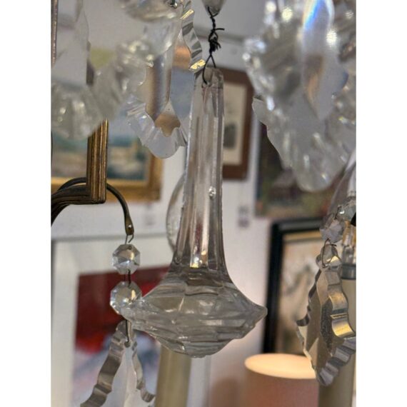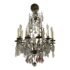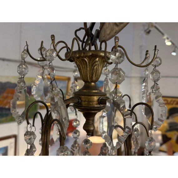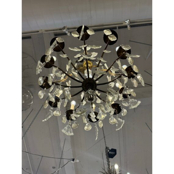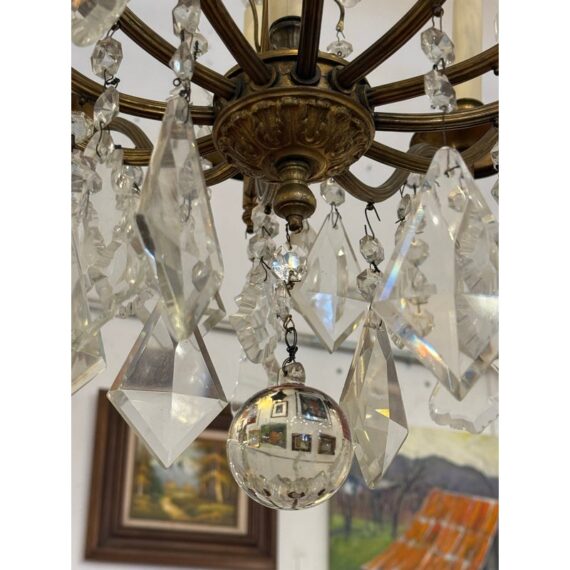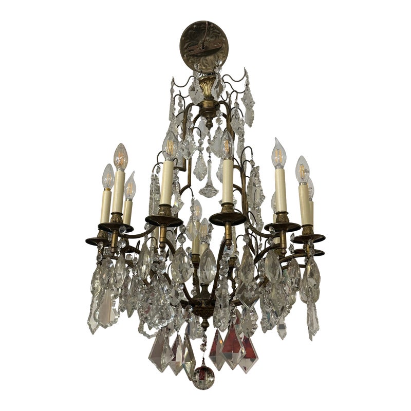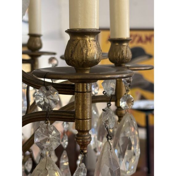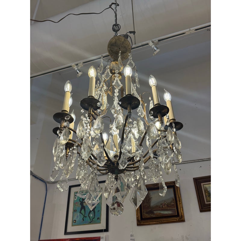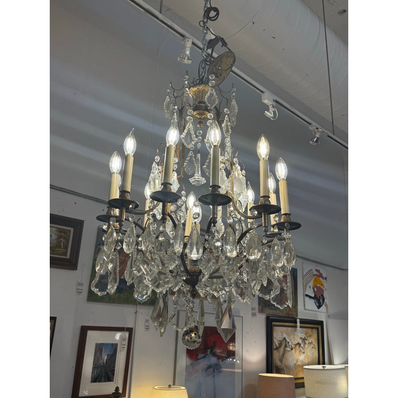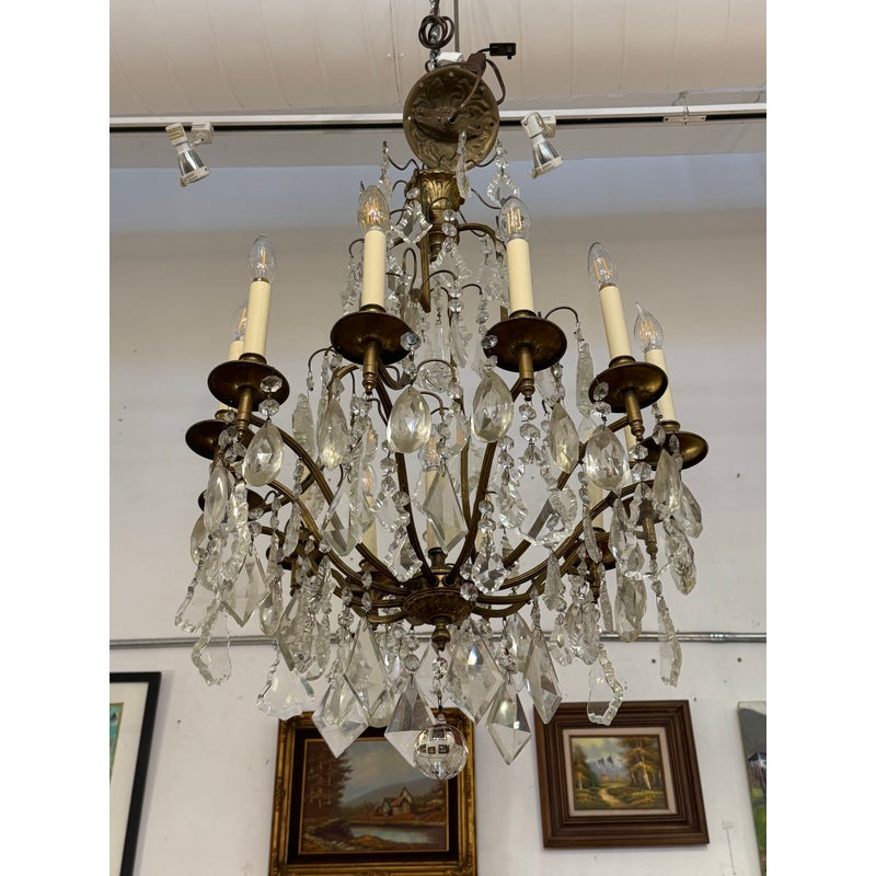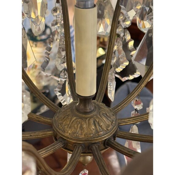 Design Plus Gallery presents a Twelve Arm Brass Neoclassical Chandelier with Crystals from the 1970s. The chandelier shows signs of hand craftsmanship to the brass canopy and cut crystals dripping off its entirety. Timeless and appealing the chandelier is in good condition for its overall age + use.