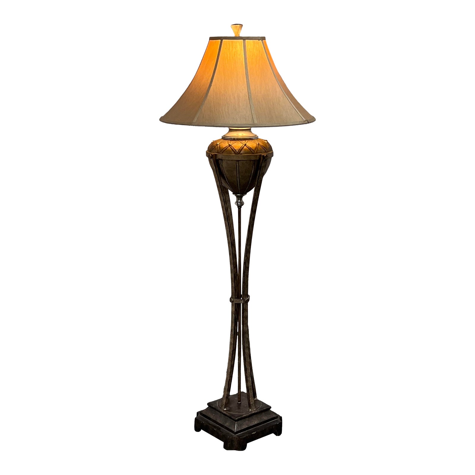 Design Plus Gallery presents a Vintage Neoclassical Design Floor Lamp. The lamp has neoclassical torches with bronzed heads and feet that are aged old tones which has an elegance all its own. Is in good condition for its age + style with its aged finish.