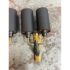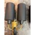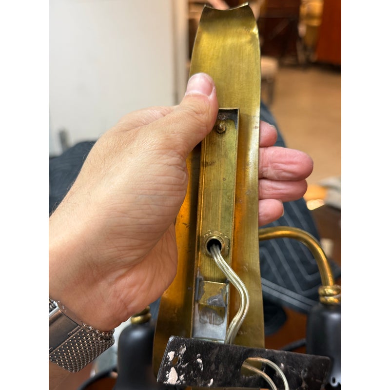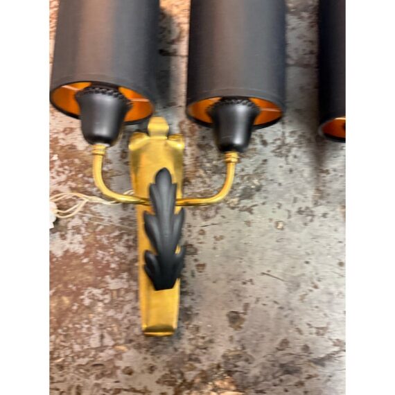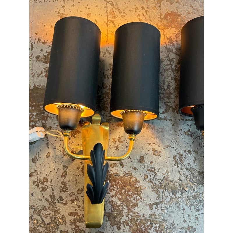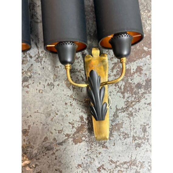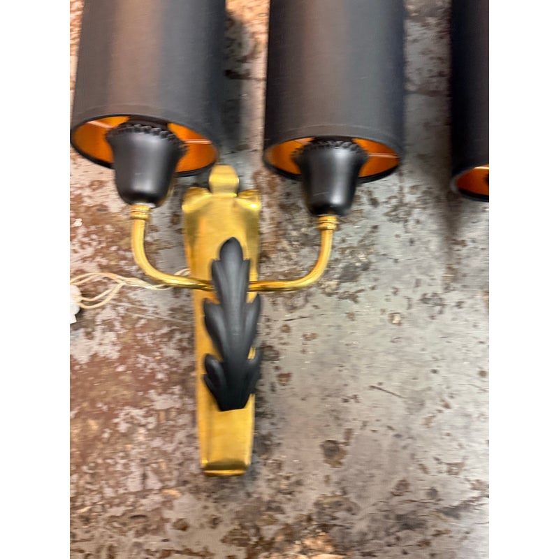 Design Plus Gallery presents a Pair of Neoclassical Wall Sconces. Each sconce showcases a vertical brass backplate with a softly contoured silhouette and a hand-applied gold tone surface. Curved brass arms extends outward to support two cylindrical shades in matte black. The shades are lined in a gold interior that enhances illumination. A black leaf-form accent rises along the center of the backplate, introducing an architectural motif that complements the structured lines of the fixture. The combination of matte black and luminous brass offers a dynamic interplay of color and material. These are discontinued models with the brand and are in good condition with visible and minimal wear from usage.