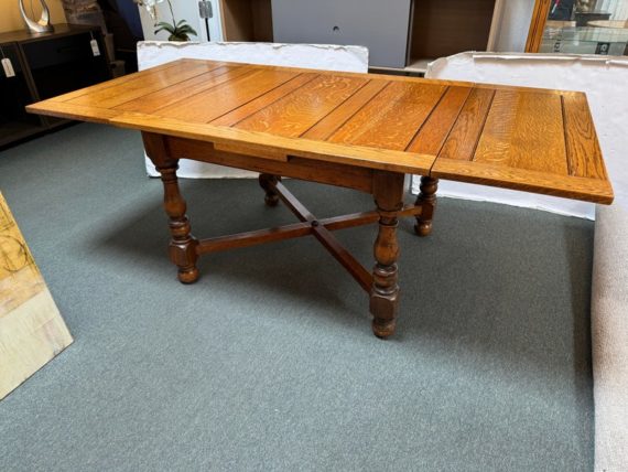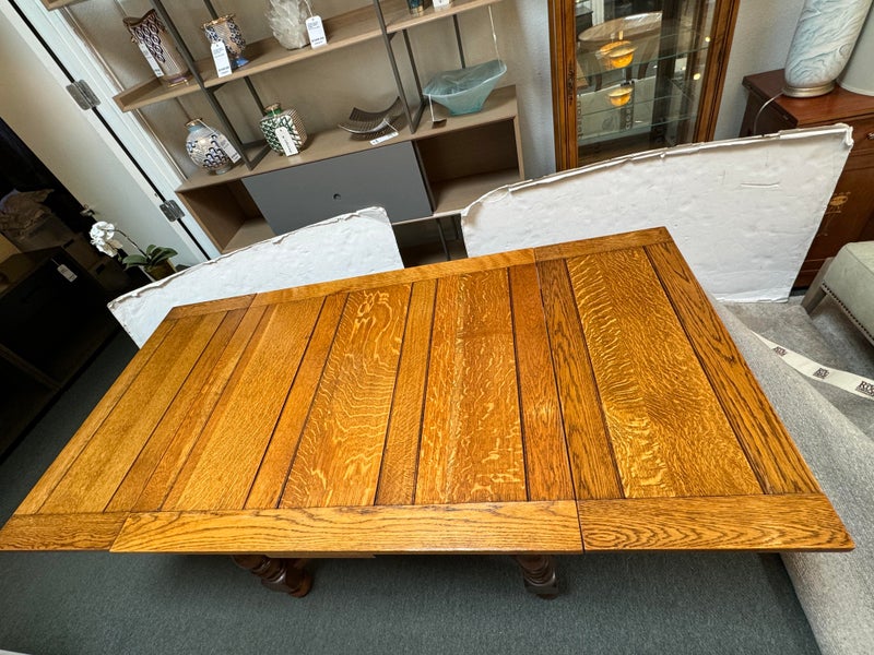 Design Plus Gallery presents a Vintage Oak Dining Table. A pair of deep draw leaves expands the table surface with room enough for guests. Wide plank oak shows off its woodgrain on top and in turned legs. Surface wear; light fading; condition is consistent with age and use.