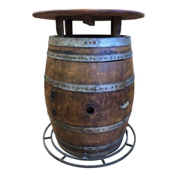 Design Plus Gallery presents a wine barrel bistro bar by Wine Enthusiast. Cook up your own wine country bistro. A retired oak wine barrel is transformed into a rustic and inviting bistro table. A pine tabletop is set at café height for relaxed dining or quaffing. There’s a convenient cabinet to store glassware, tableware or spirits bottles, and a traditional bar rail adds to your comfort. Indoor use only. The finish is Whiskey. Made in the USA.