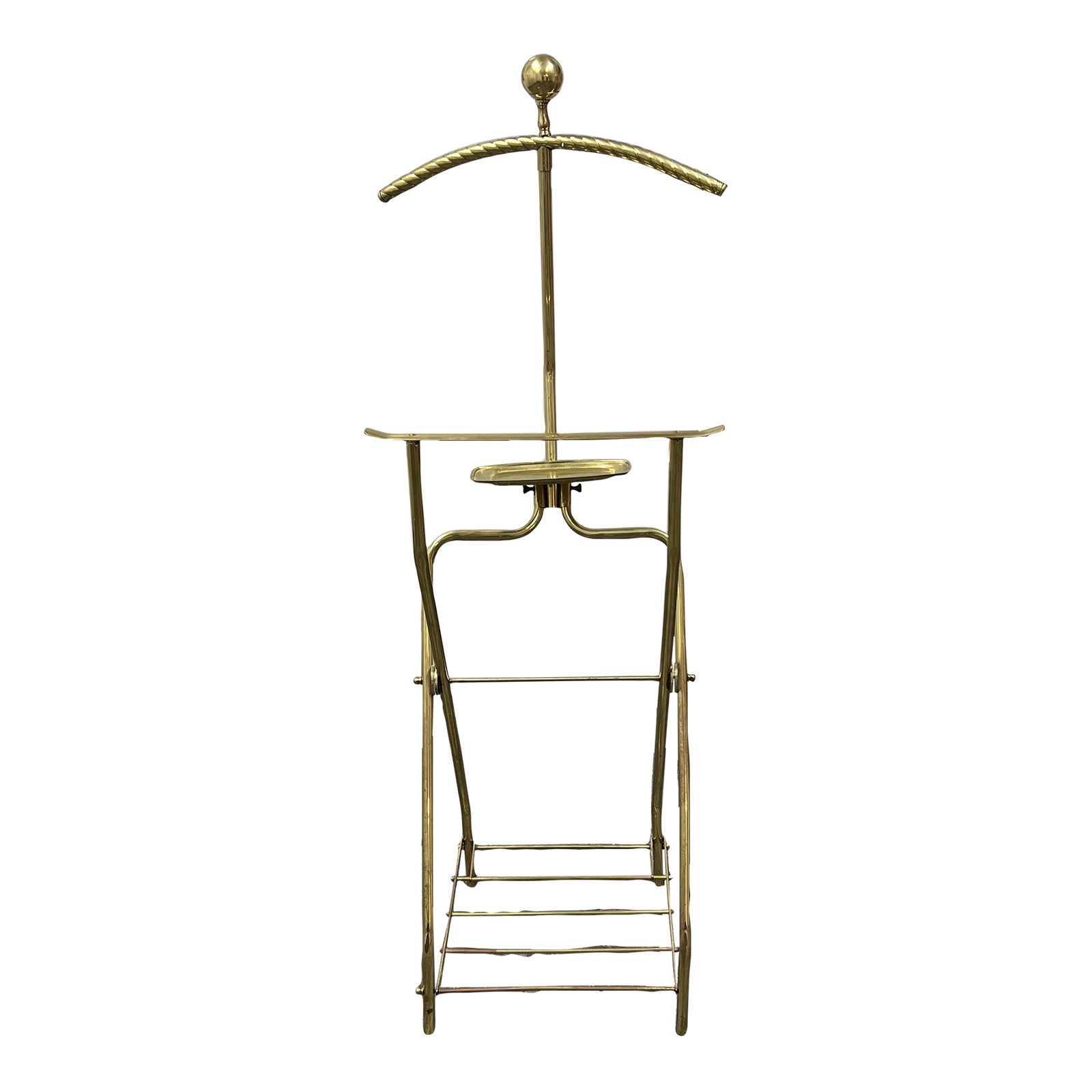 Design Plus Gallery presents a Vintage Oiled Brass Valet. From another time, this valet creates a moment for one to spend planning the day’s attire. Oiled brass frame is hinged for easy storing and transportation. There is visible wear through out the brass, valet is in good condition.