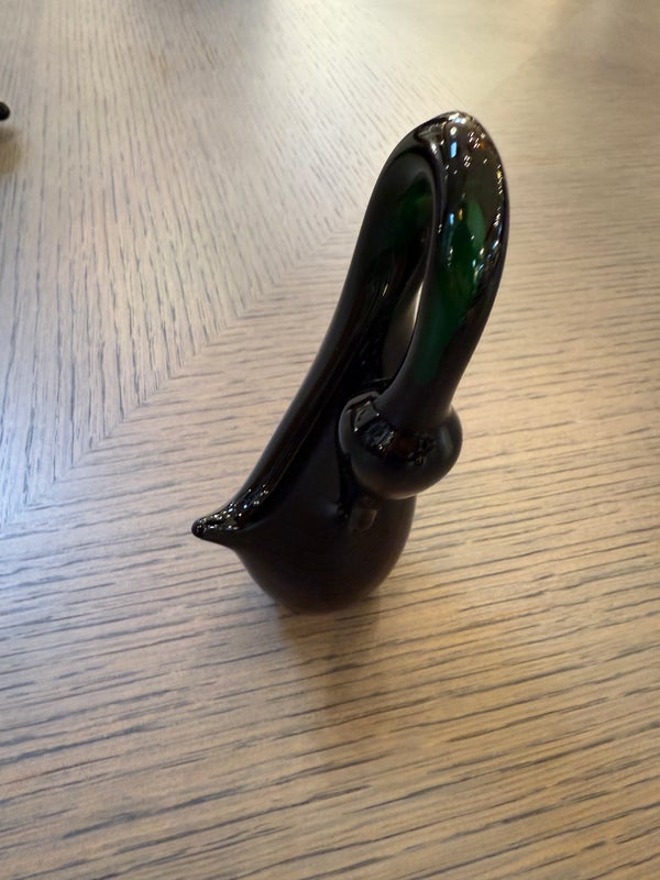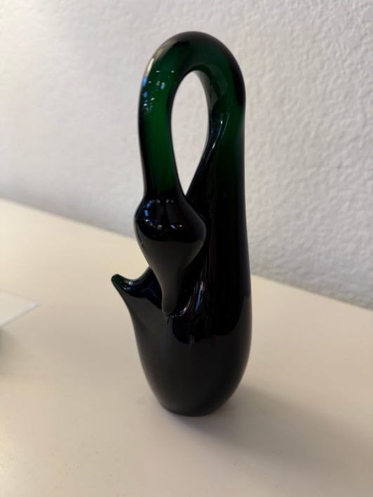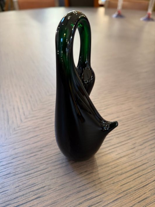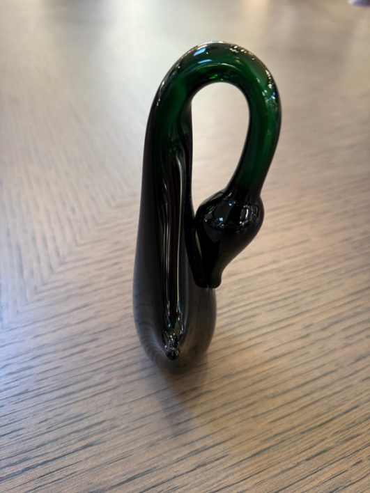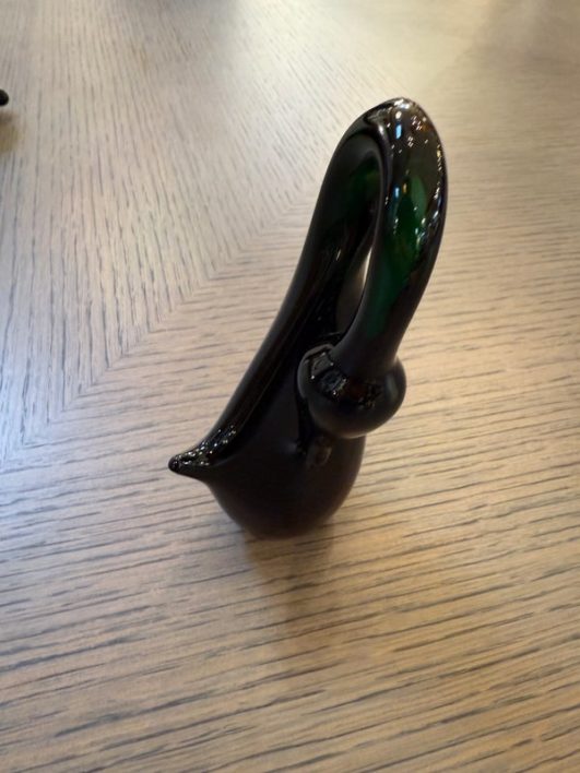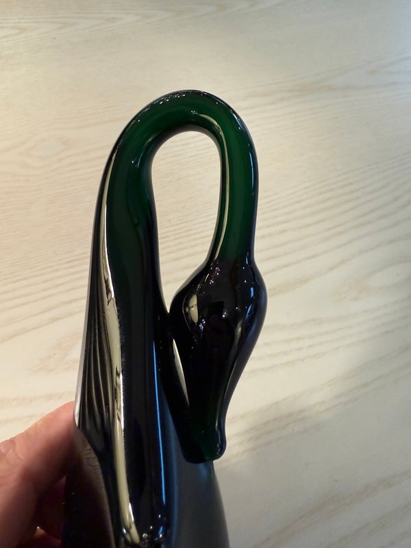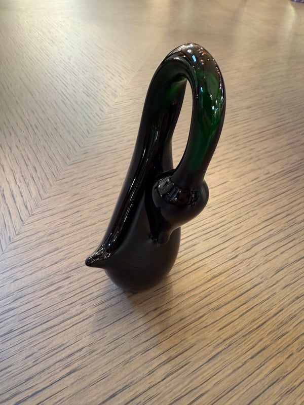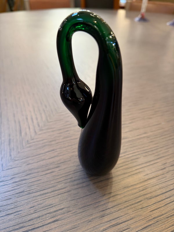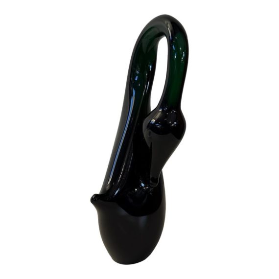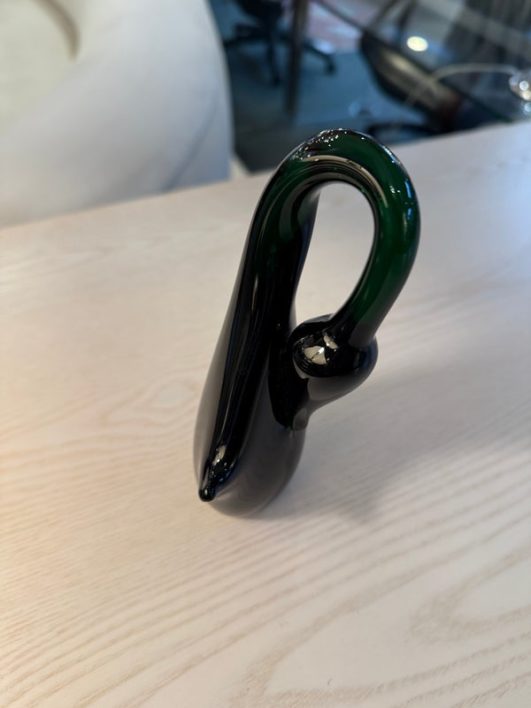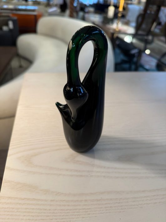 Design Plus Gallery presents a Vintage Swan Sculpture by Orient & Fume. This elegant signed piece captures nature’s inspiration in green molten glass. The graceful avian silhouette can be is immediately recognizable. Signed by artist on base. Little evidence of wear; condition is good for age and use.