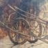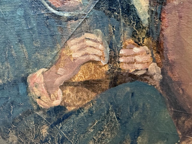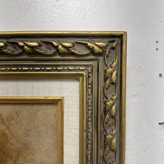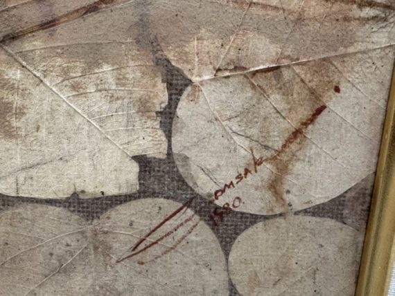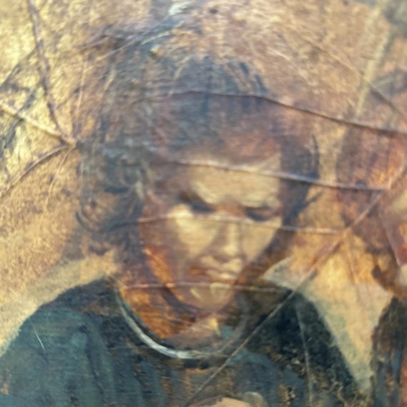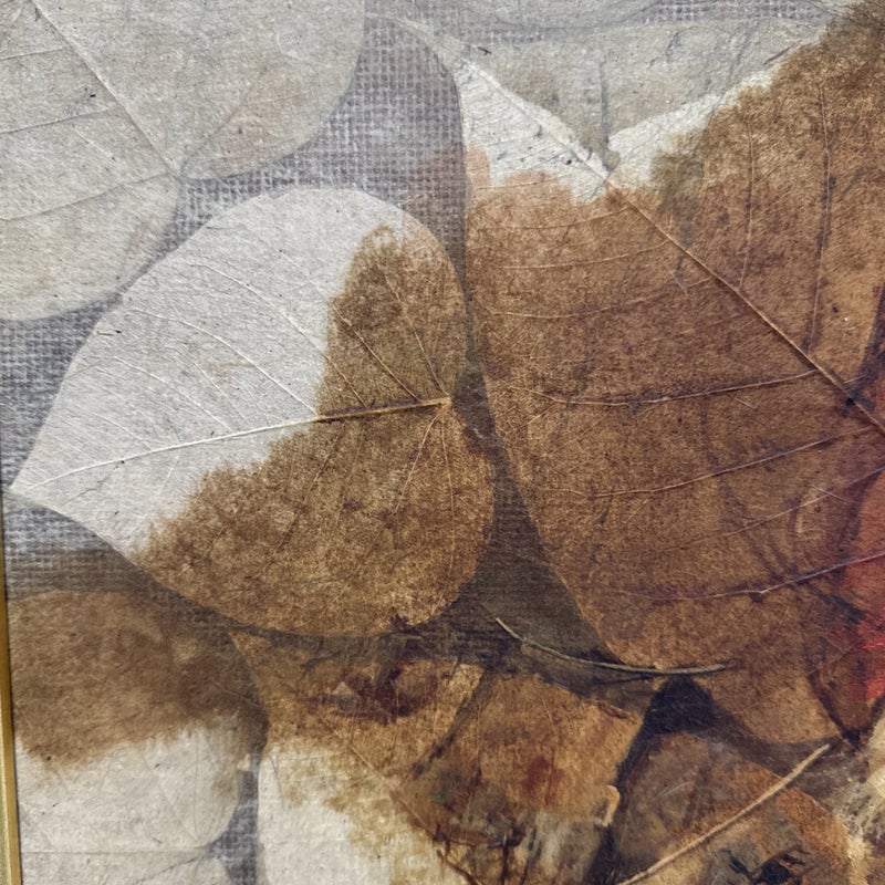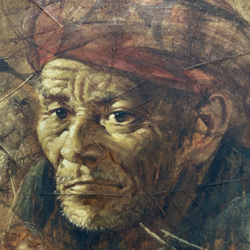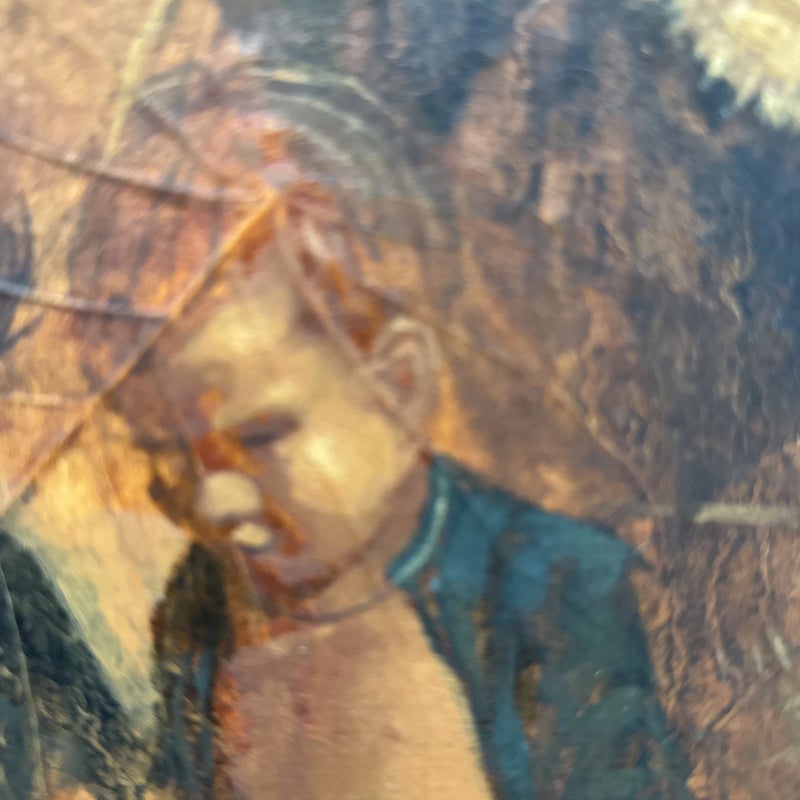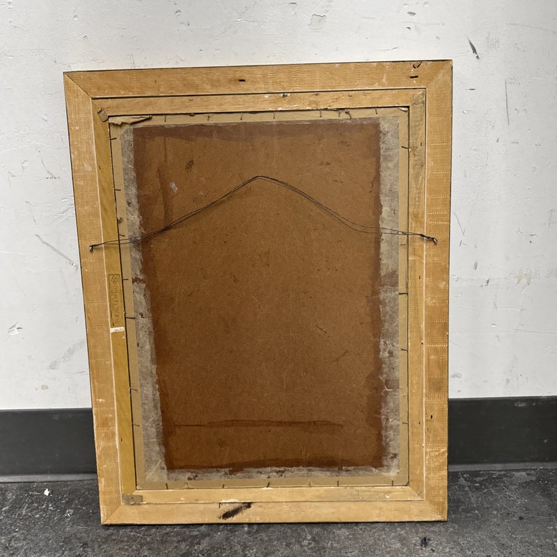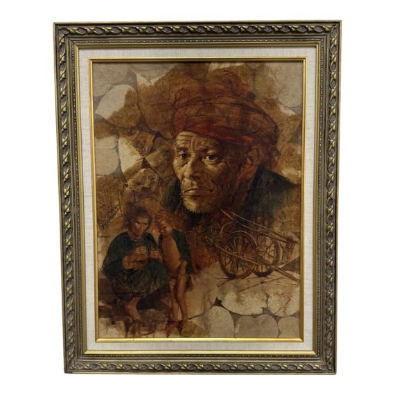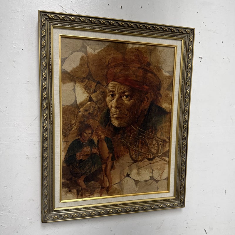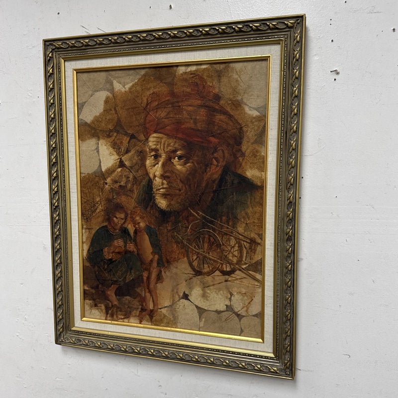 Design Plus Gallery presents a Western Civilization Scene from the Late 20th Century, Signed + Dated. The scene shows a wagon wheel truck that is stopped with scenes of weather worn people of varying ages. They are all layered atop the painted sediment leaves. Muted colors and forlorn look in their eyes allow us to appreciate the work that the westerners had to overcome to push through such a long journey to the West. Is in good condition for its vintage age.