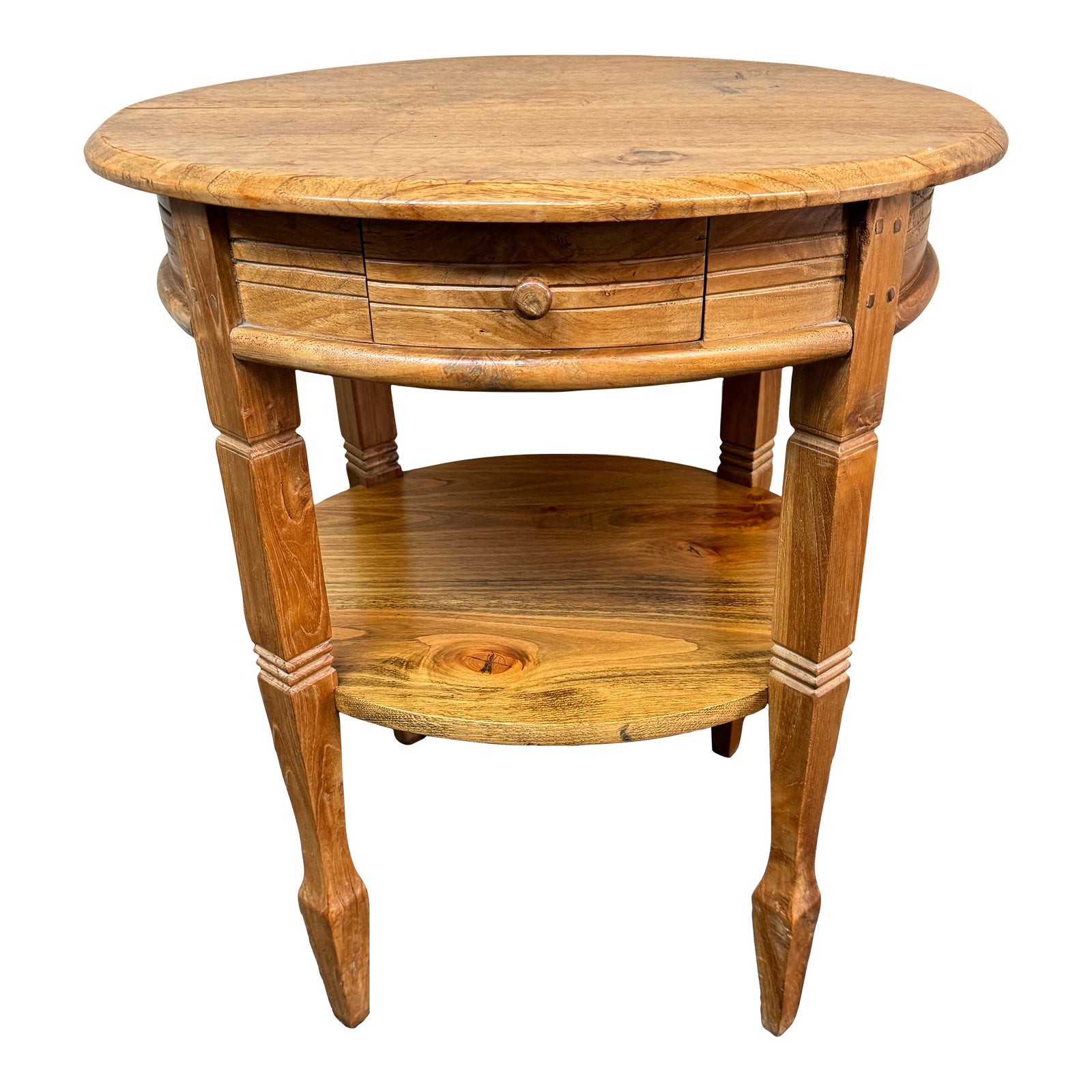 Design Plus Gallery presents a Vintage Round Side Table. The scale works for many uses, the style is charming and very functional. Simple bullnose rounds in solid pine form the top surface and had lower shelf. Apron and tapered legs have a ribbed detail. Visible surface wear; condition is consistent with age and use.