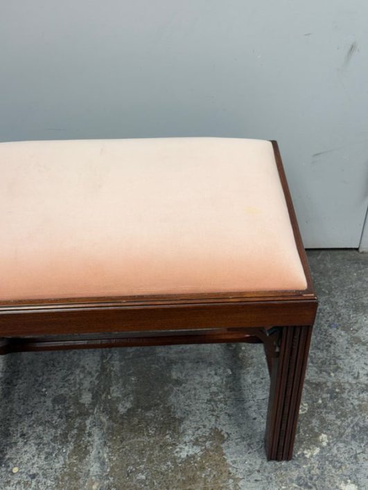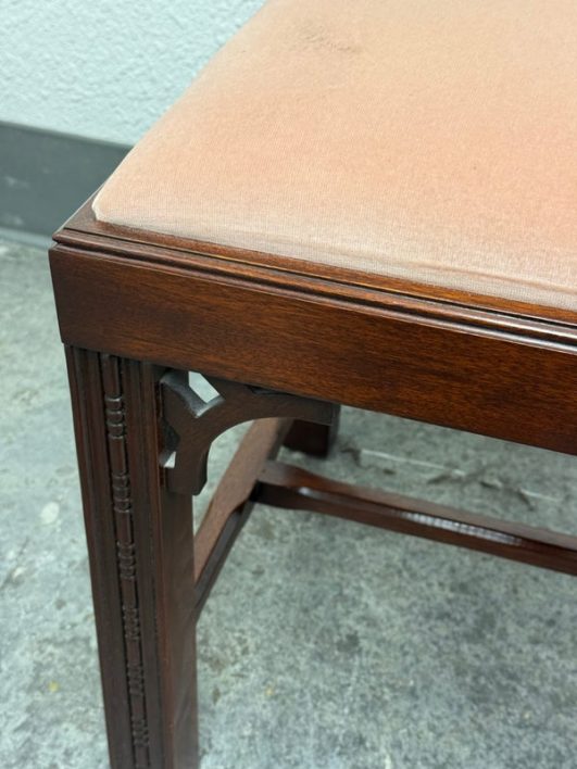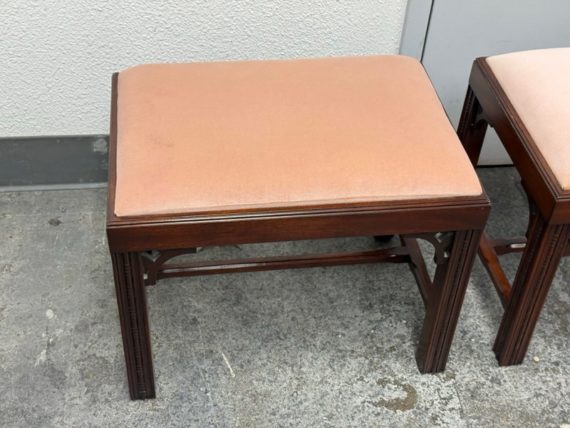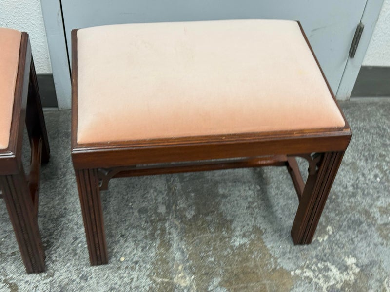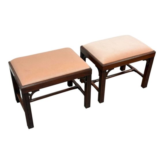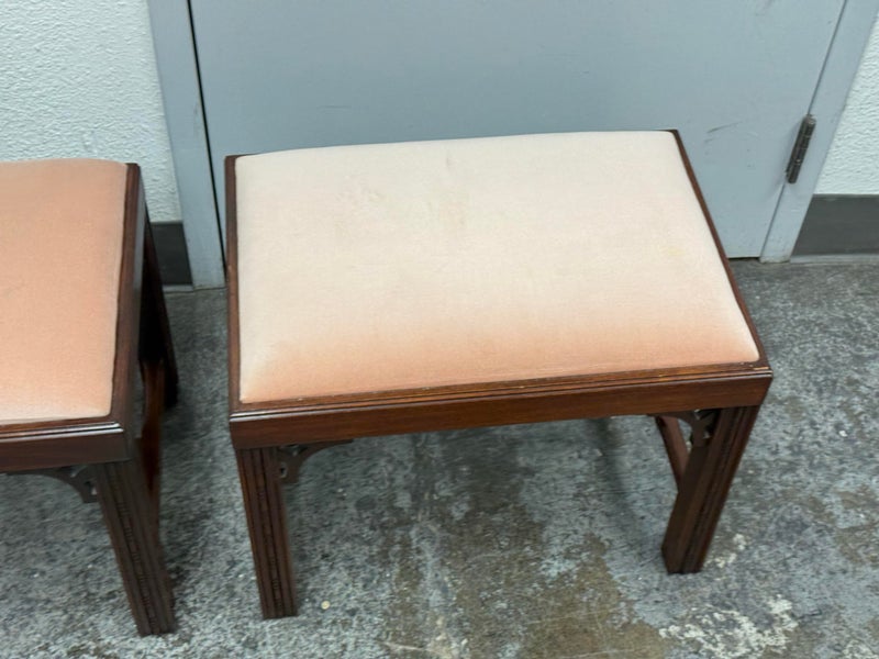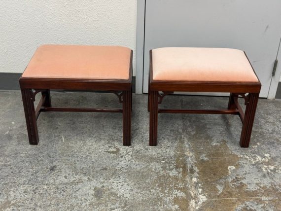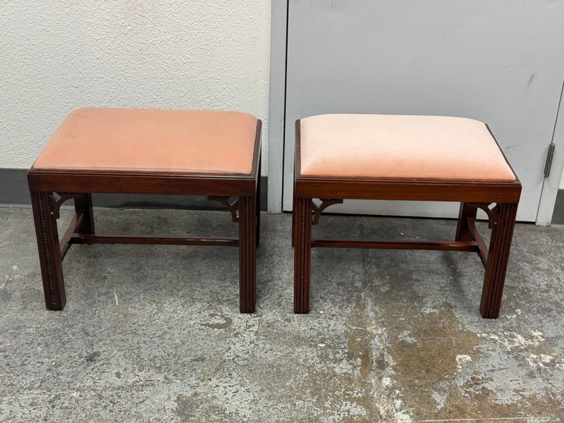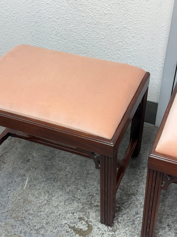 Design Plus Gallery presents a Pair of Ming Style Benches. They have traditional Chinese joinery to the frame with the addition of soft peach tone silk velvet upholstery. The fabric and wood legs do show minor signs of wear, with one being lighter due to sun exposure but are overall in good condition for their usage.