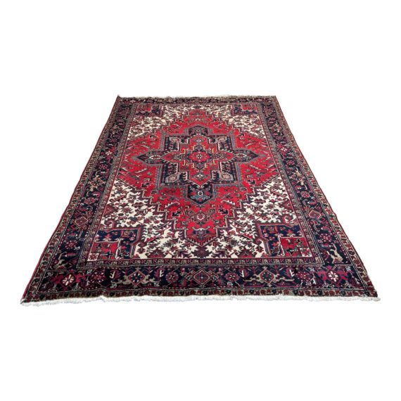 Design Plus Gallery presents a 8ft1in × 11ft3in Vintage Heriz Area Rug. Beautifully handwoven, the tightly knotted navy medallion pattern contrasts beautifully against intense red hues with details in blue, khaki and off white.. Wide border finishes in short fringe. Discolored, uneven fringe, side binding needs attention. Visible wear; condition is fair for age and use.