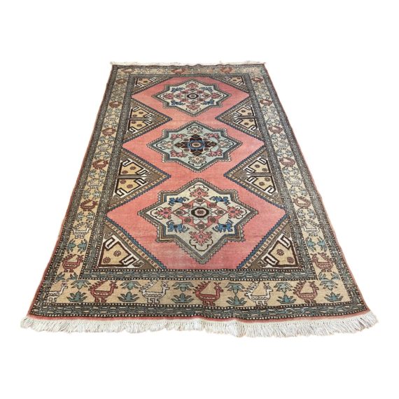 Design Plus Gallery presents a 5ft 5in x 9ft 1in Vintage Persian Area Rug. Handwoven with wools in a neutral colors. A faded pink accented with turquoise and light pastels, browns and cream. Small area of natural distress and pealing towards a corner. Minor wear from age and usage. Consist of wool fringe.
