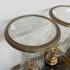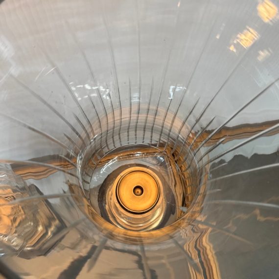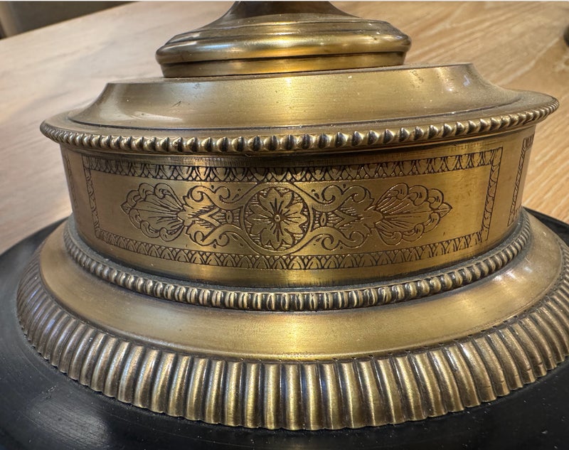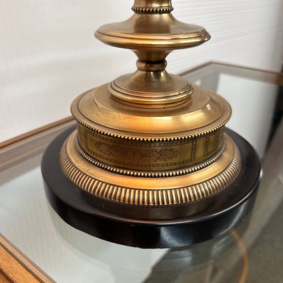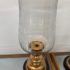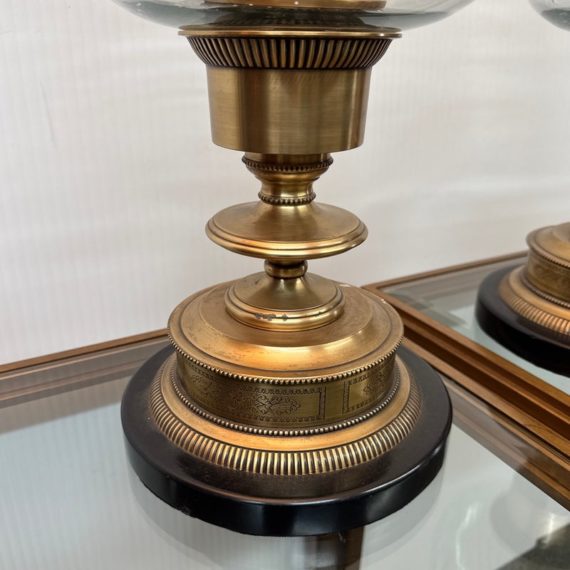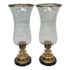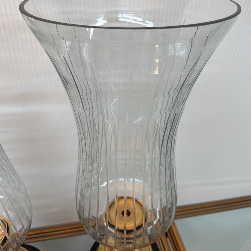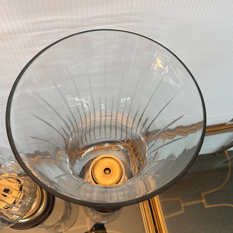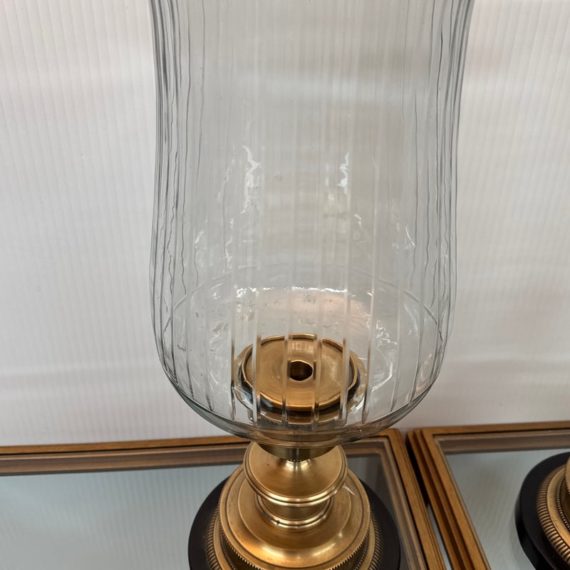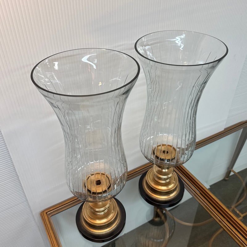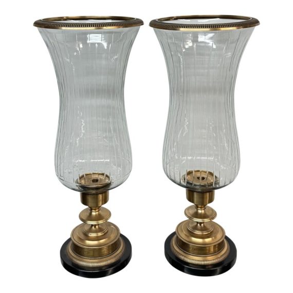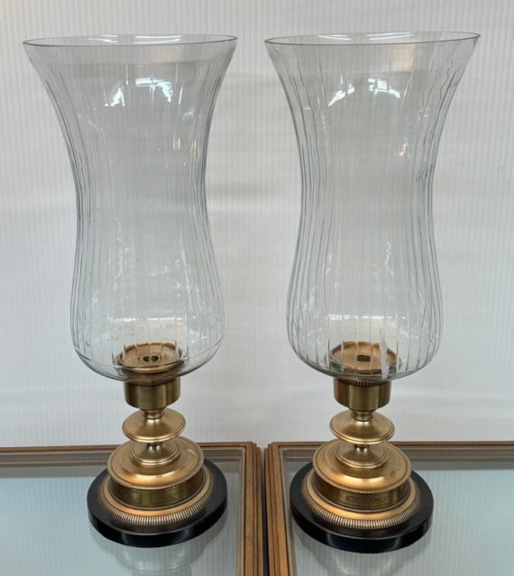 Desig nPlus Gallery presents a Pair of Vintage Pierre Deux Hurricanes. Stunning etched glass, with removable brass collar, flairs elegantly above each large turned brass base. The etched and fluted columnn is elevated on black marble disc. The holder can accommodate dinner candles or tapers. Minimal surface wear; condition is good.