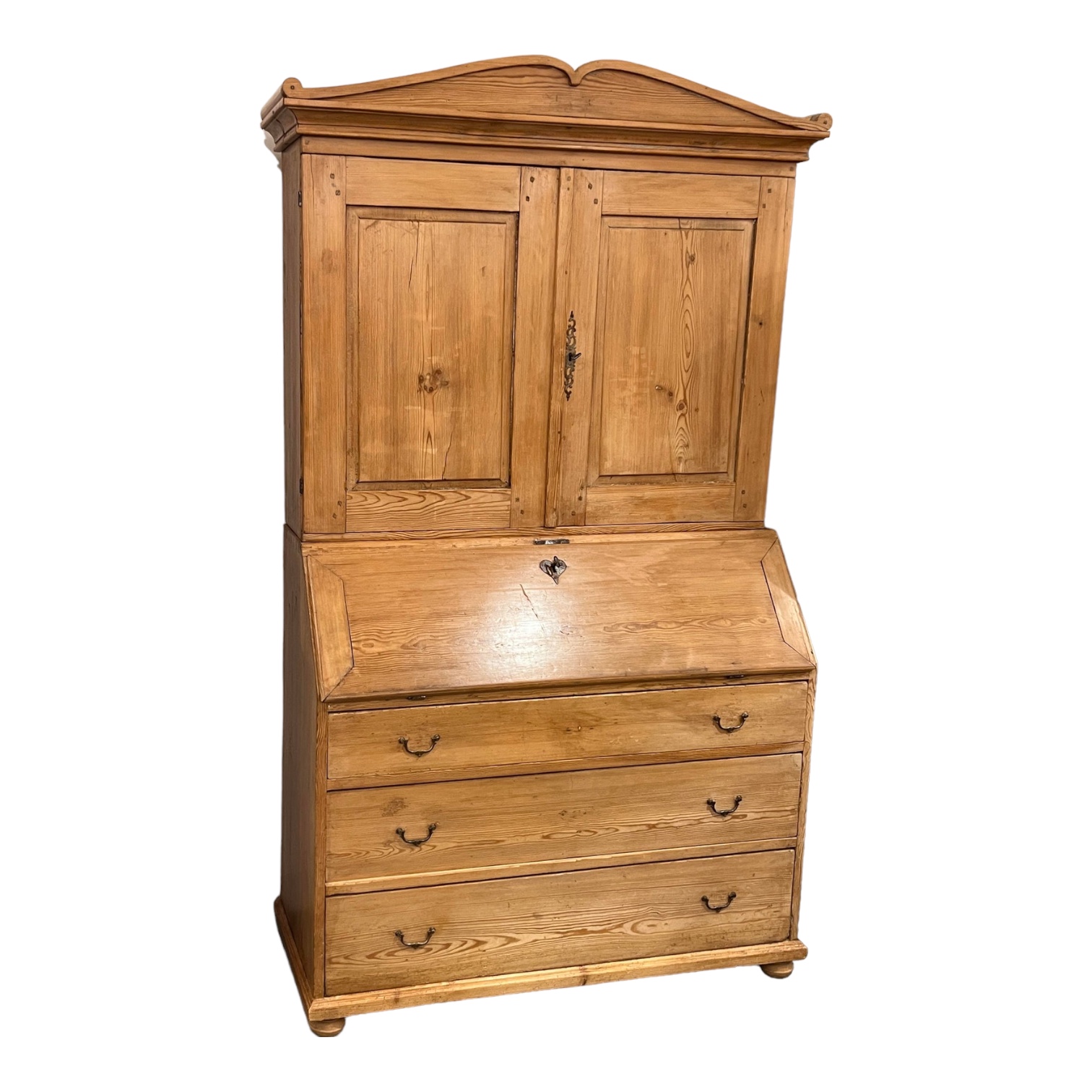 Design Plus Gallery presents a Vintage Pine Drop Front Secretary Desk. This vintage two piece drop front secretary has plenty of organizational capacity. Starting with the upper portion cupboard, the doors open to reveal three equal size shelving portions. The upper shelf has piece attached that allows for wine glasses to be stored. In the lower half there are three drawers of staggered height. The drop down on the secretary reveals plenty of small cubbies and a sweet inner cupboard. All of this is sealed with a lovely brass plate in the shape of a heart. This is in good condition, visible wear consistent with its vintage age + use.