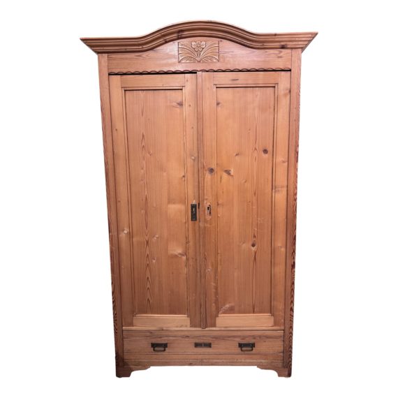 Design Plus Gallery presents a Vintage Pine Armoire, Wardrobe /Linen Cabinet. Crafted from pine woods. Both cabinet doors open and close properly. There are two interior shelves that can be removed easily. It is missing the hanging bar itself but there is placement on the top to have one made and added. Lower bottom shelf is functional as well. It’s a great cabinet that could be used in a variety of way around the house. Is missing a key and one of the metal hardware elements on a cabinet door. Is in fair condition, visible wear from usage + age.