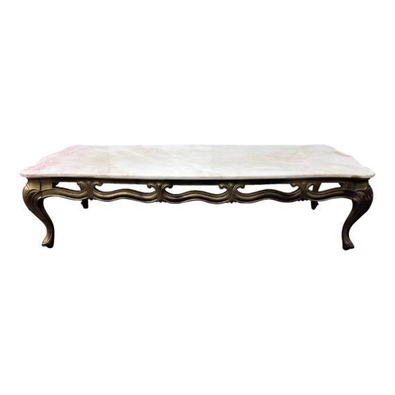 Design Plus Gallery presents a T.W.C. Marble Top Coffee Table with Old World Charm Base from Portugal. Marble is mostly cream + white with an unusually bright pink corner. Claw foot tilted gold legs and scrolled frame give off a traditional elegance. Surface conditions are present but overall good condition consistent with age + use.