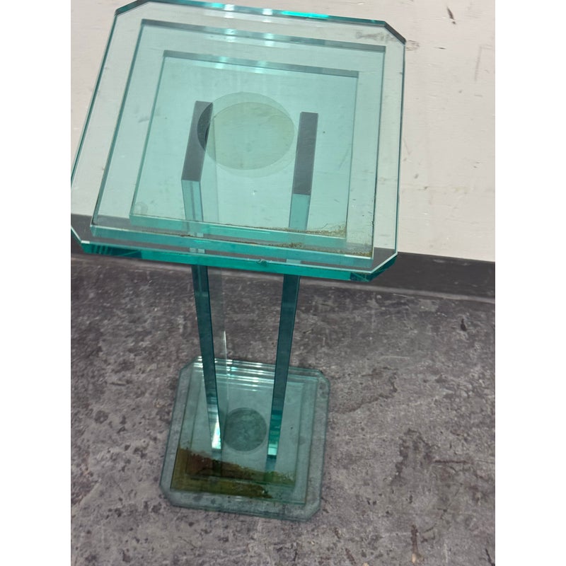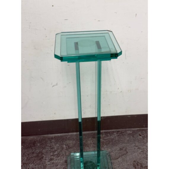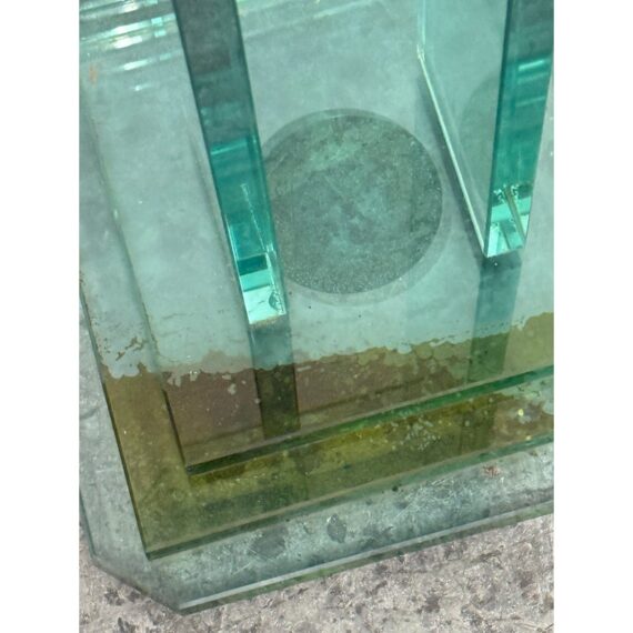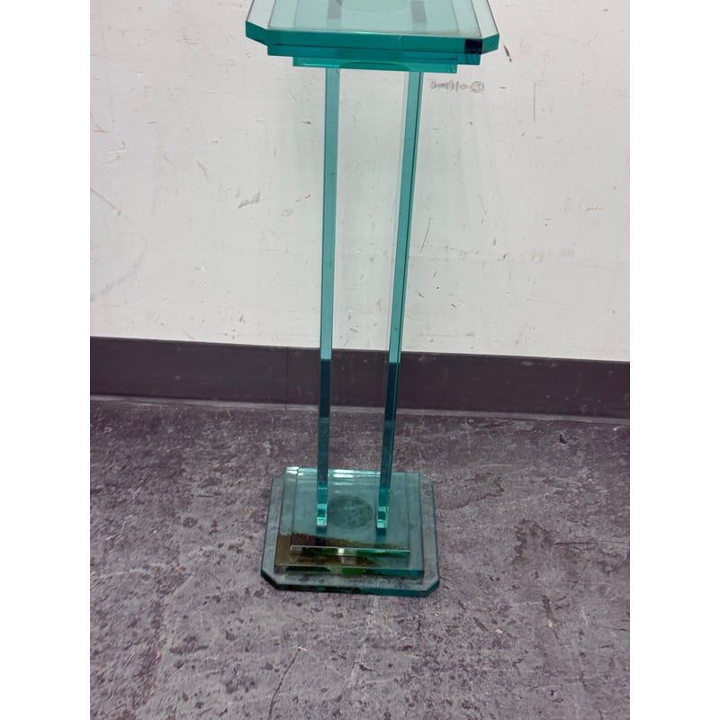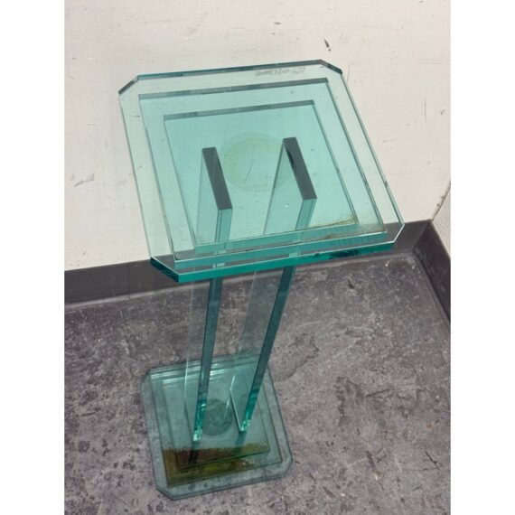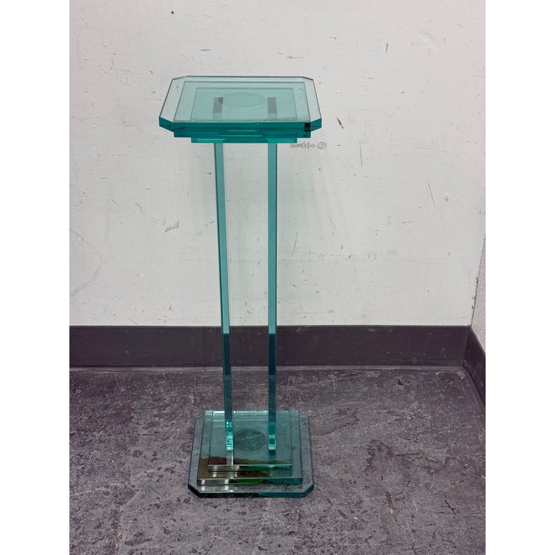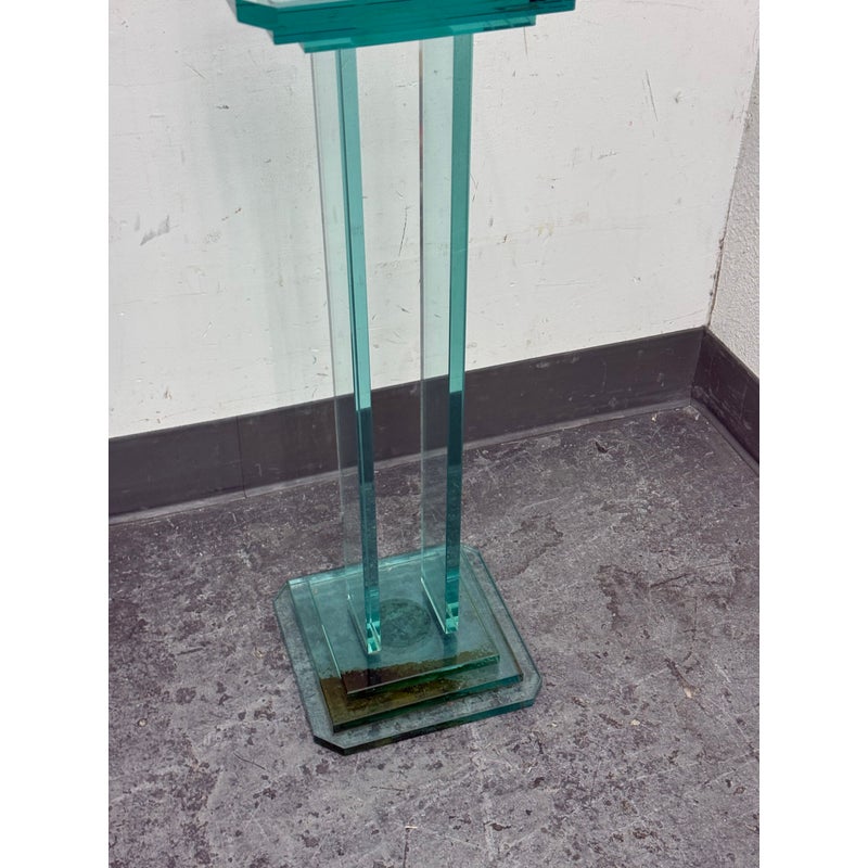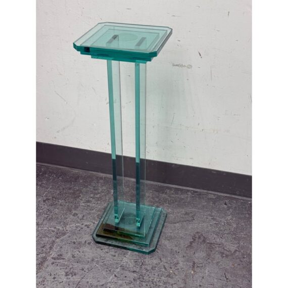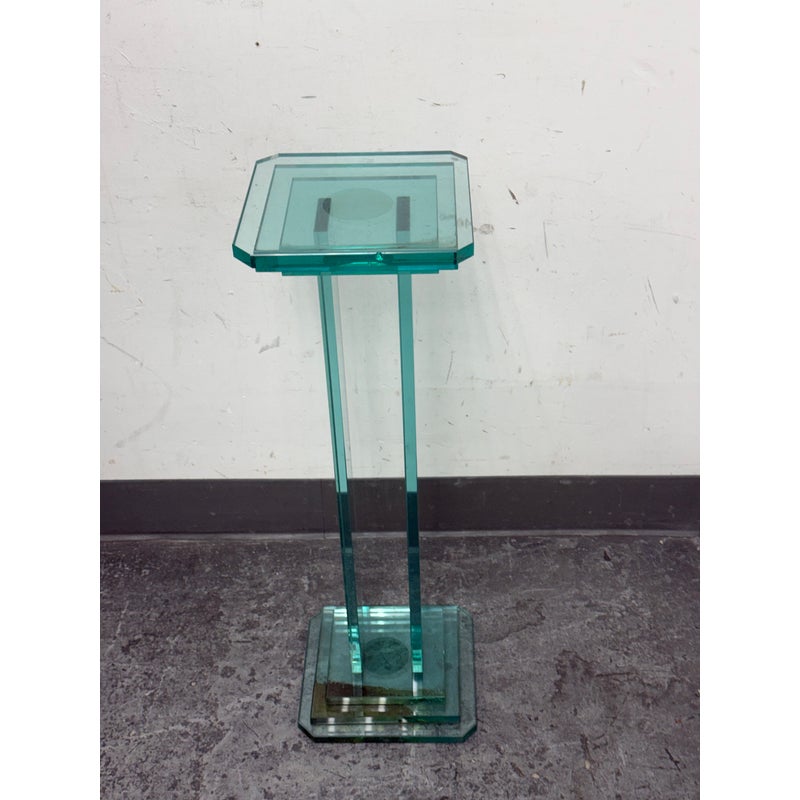 Design Plus Gallery presents a Vintage Glass Pedestal Stand. This vintage square glass column pedestal offers a striking blend of function and elegance, perfect for use as a display stand or plant stand. Its architectural silhouette gives a subtle nod to Post Modern, Art Deco, and Mid-Century Modern design, characterized by clean lines and minimalist form. The glass features a soft celadon green hue, adding a gentle touch of color without overpowering your space. Over time, a visible patina has developed from age and use, enhancing the piece’s authentic vintage character and charm. Whether showcasing a sculpture, vase, or your favorite houseplant, this glass pedestal brings both sophistication and history to any setting. In good condition, visible scratches and minor chips and minimal wear from usage.