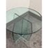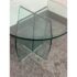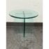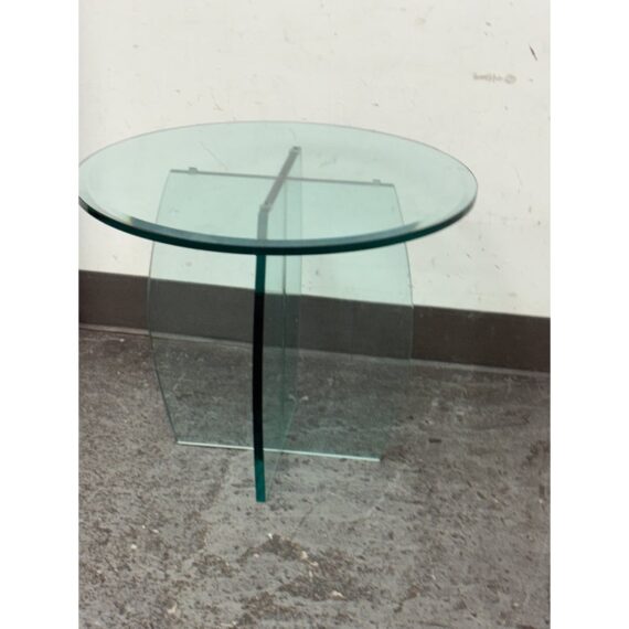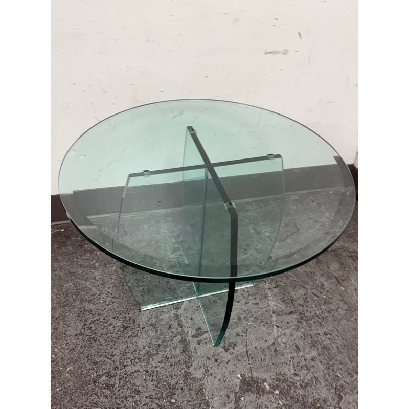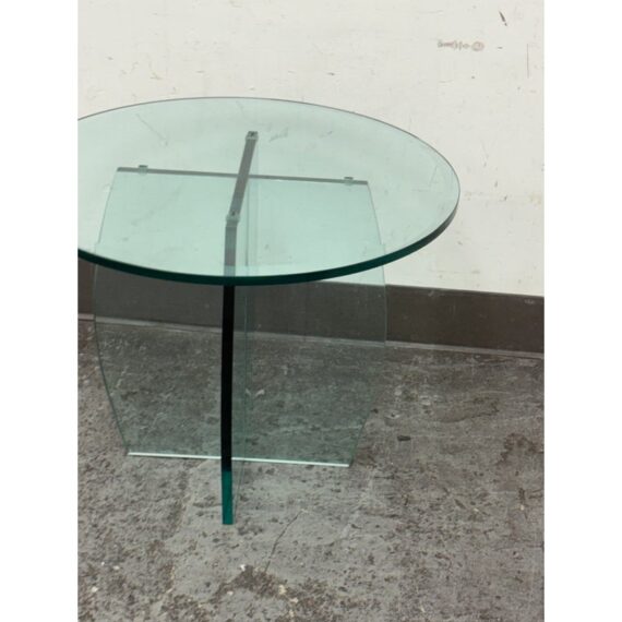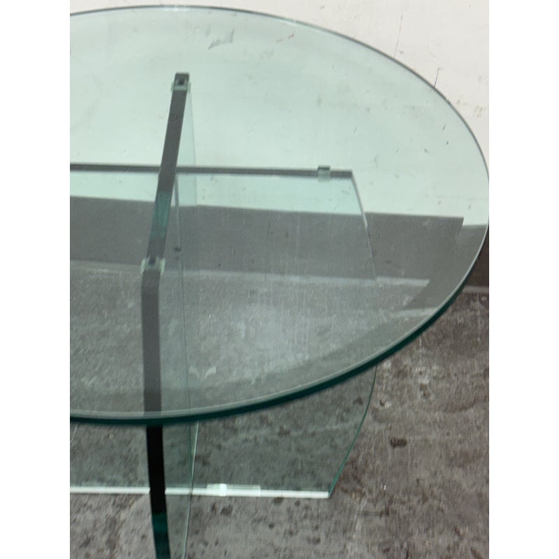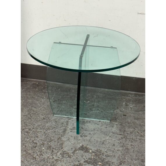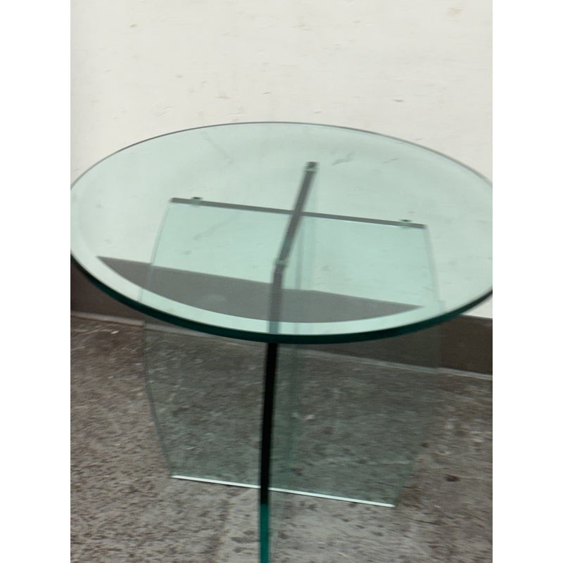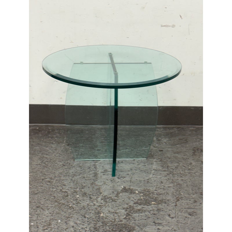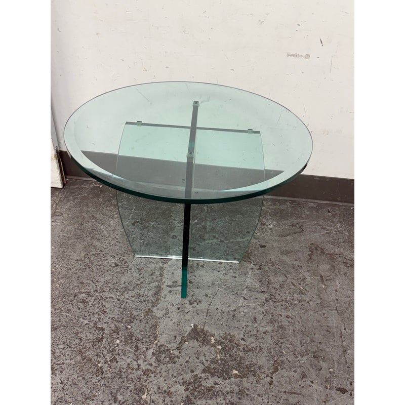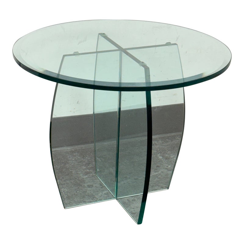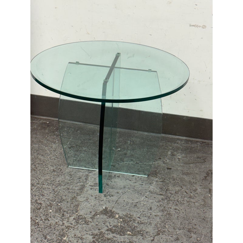 Design Plus Gallery presents a Vintage Round Glass Side Table. This vintage round side table exudes postmodern charm with its distinctive thick beveled glass top in a subtle, celadon green tint. The glass, notable for its weight and quality, features a masterfully curve cross base, adding an artful touch of sculptural interest beneath the surface. Decades of graceful use have left visible scratches across the glass, the characterful marks telling a story of age and authentic vintage appeal. Elegant in both form and color, this side table brings a unique blend of artistic craftsmanship and timeless modern design to any space. In good condition, visible and minimal wear form usage.