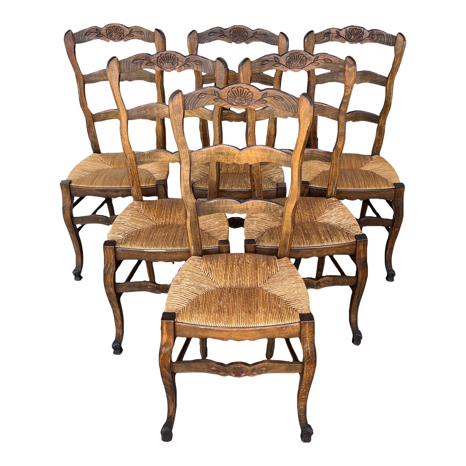 Design Plus Gallery presents a Set of Six Vintage Dining Chairs. With all the Provincial details expected, including scalloped ladder back, woven rush seats and gently curved legs, the set charms. Lovely in kitchen or where space is a premium. Two of the chairs could be tightened, one seat has surface damage to rush.