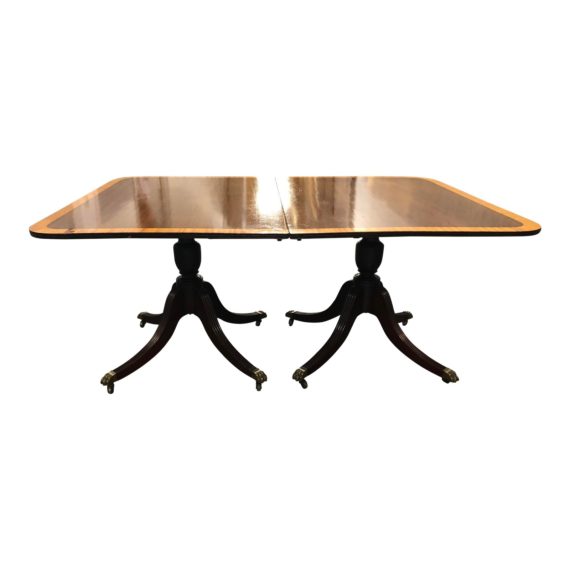 Design Plus Gallery presents a Queen Ann Style Double Pedestal Base Table. The table can be separated into two side tables, joined by a locking mechanism. The table has a mahogany finish, highlighted with a lighter border. Visible scratches and wear. Each pedestal as four legs with casters. This gem is still a classic and suitable as a dining table, office desk or two separate pedestal tables.