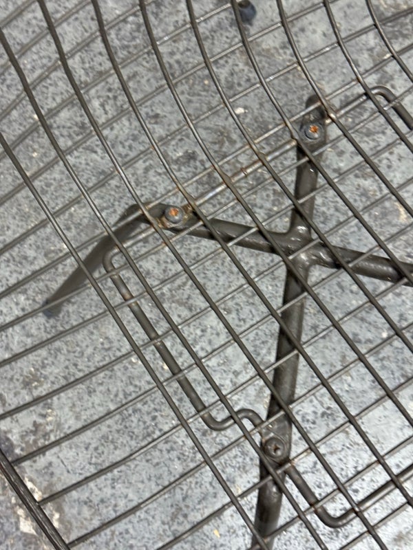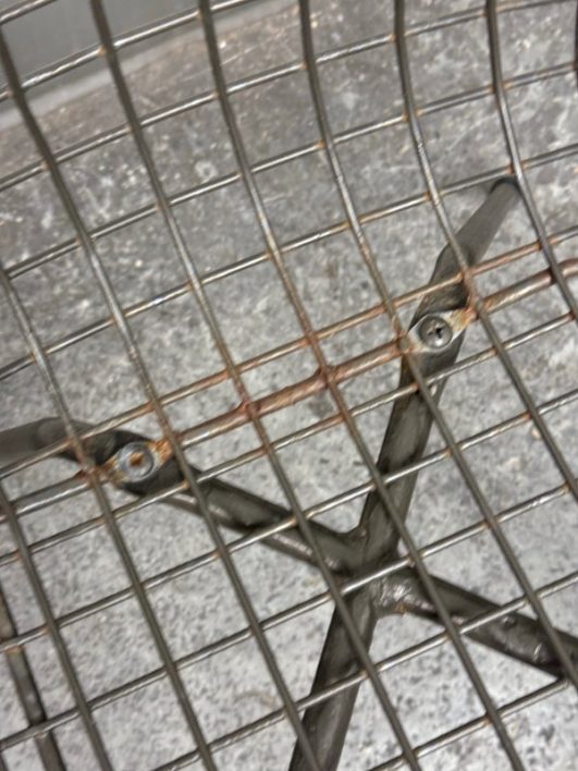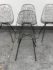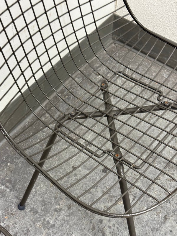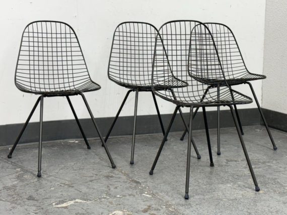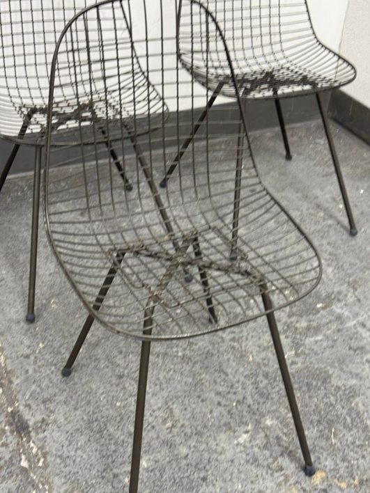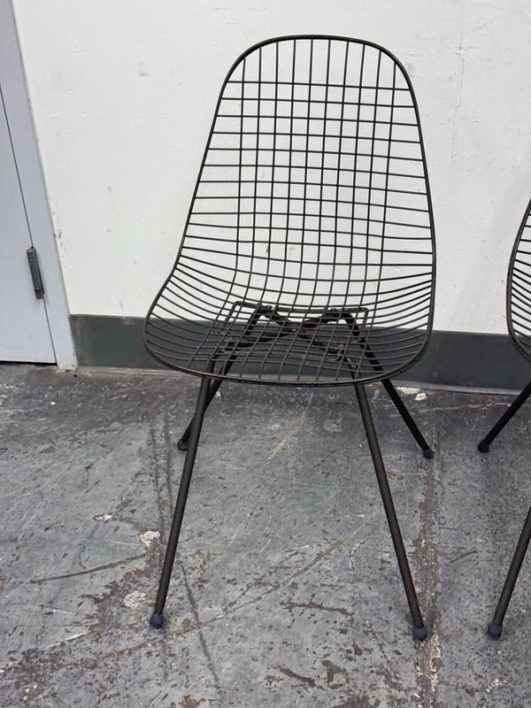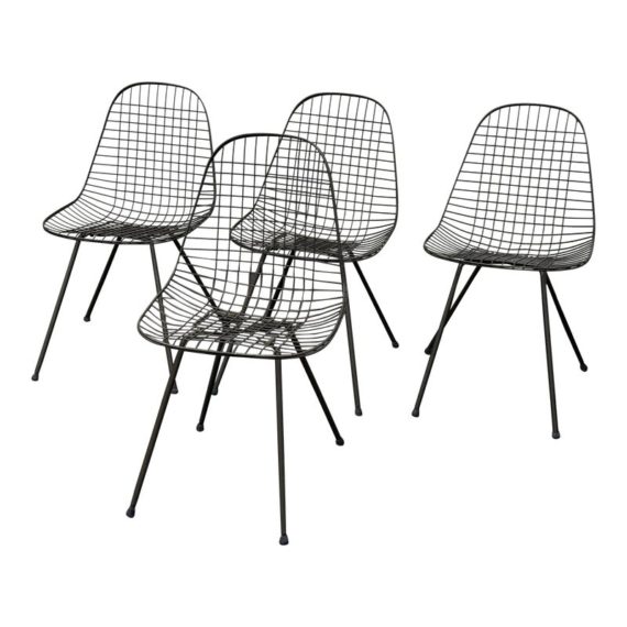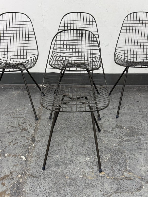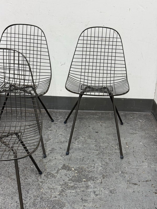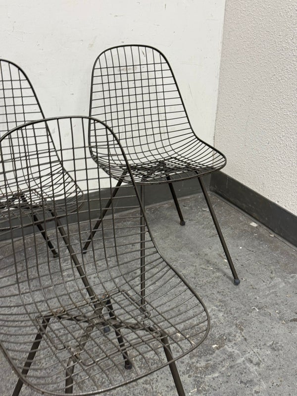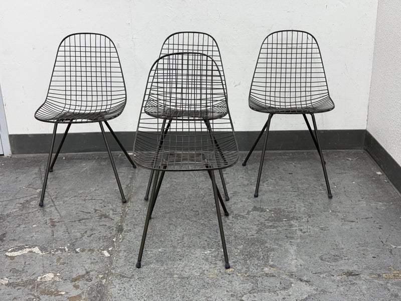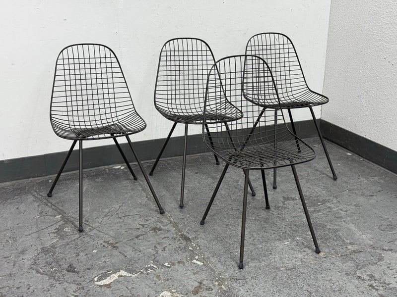 Design Plus Gallery presents a Set of Four Metal Dining Chairs Designed by Ray + Charles Eames, Produced by Herman Miller in the Mid 20th Century. The wire chairs were an experiment led by Ray and Charles Emes to design a metal version of their single-shell form chairs in the 1950s. Their creation is an ongoing hit and the chairs are still available to purchase decades later. These are of vintage age and in good condition for their age due to refurbish with some areas of use, such as patina to the steel wire.