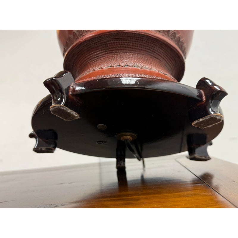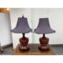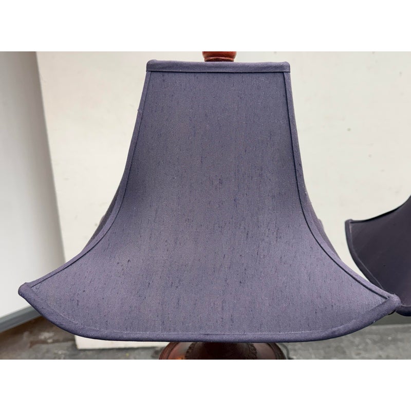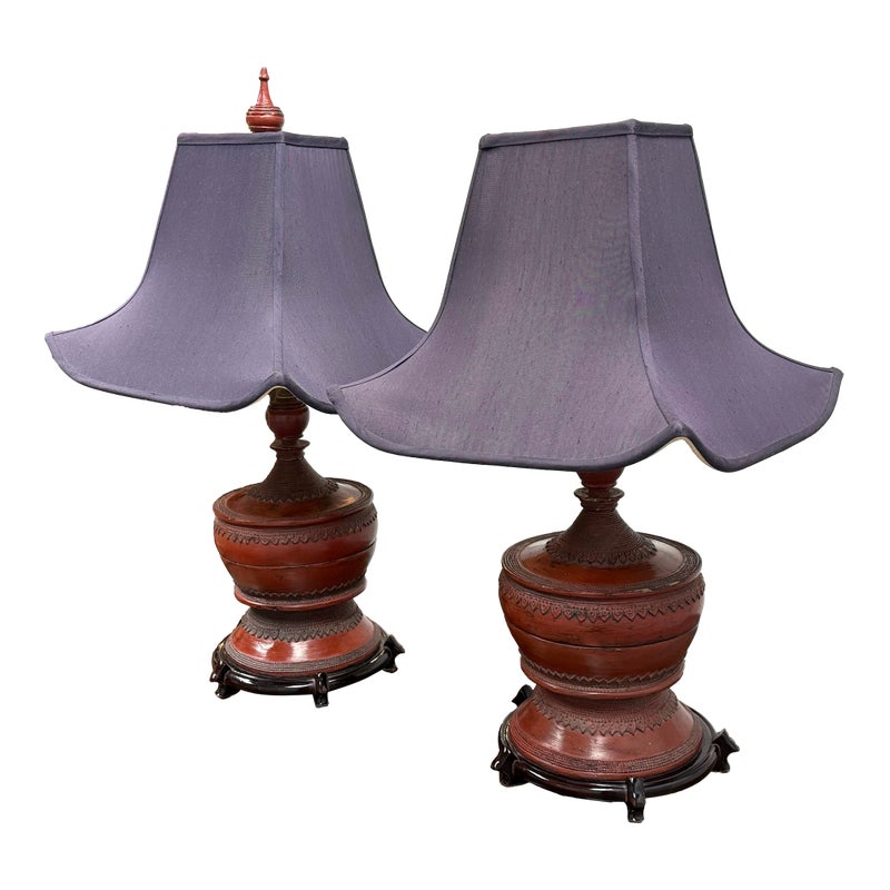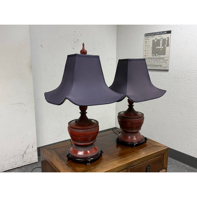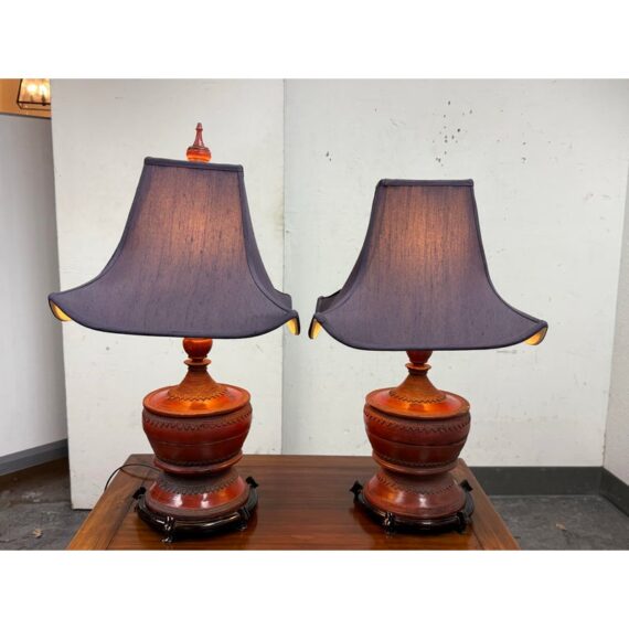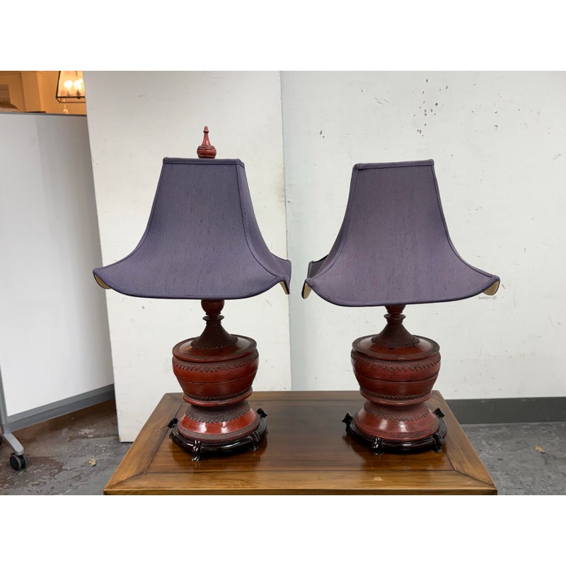 Design Plus Gallery presents a Pair of Red Terra Cotta Table Lamps with Identical Light Purple + Shaped Lamp Shades. These clay table lamps offer an interesting design with etched design elements all along these highly shapely bodies. Their bodies are fitted with a dark wood, likely rosewood, base that has Ming design elements. The lamp shades are as unique as we have ever seen, in a matte lavender shade, with down turned edges at four seams. They are in good condition with minimal wear for their usage. One finial is missing.