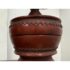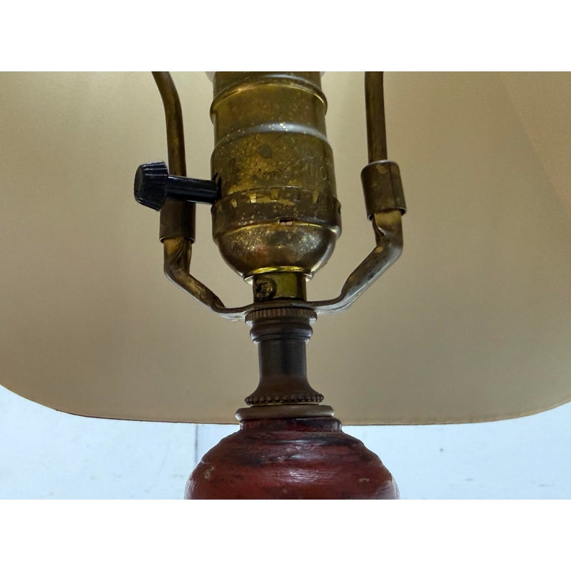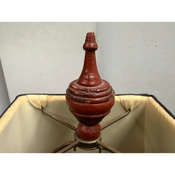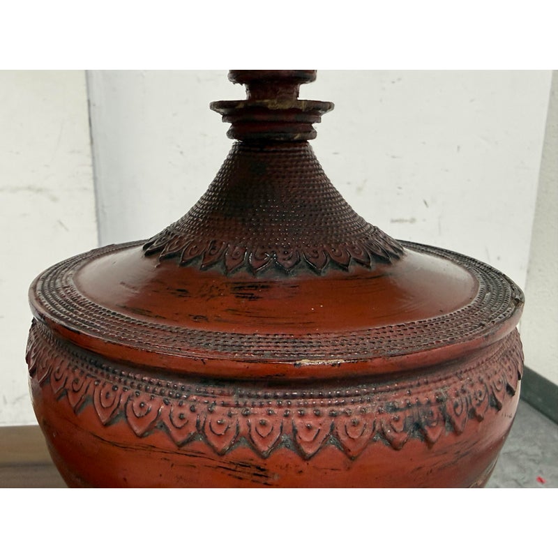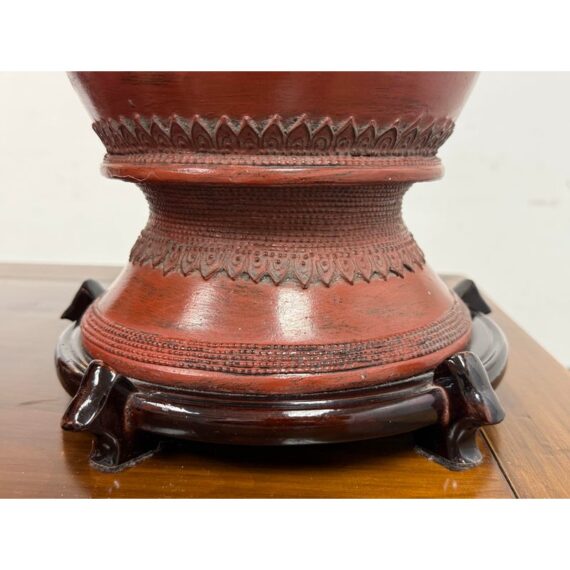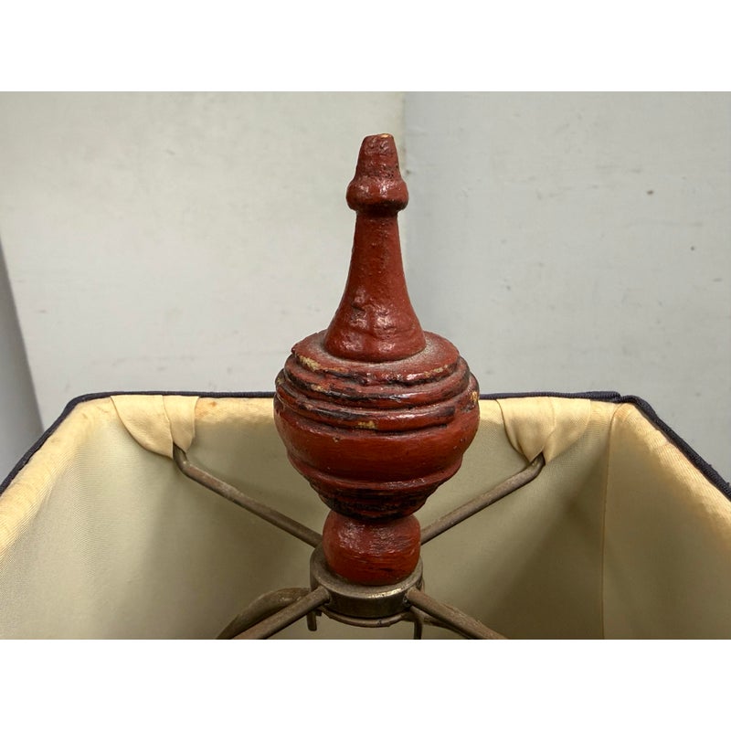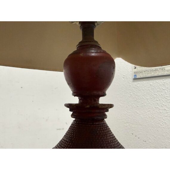Design Plus Gallery presents a Pair of Red Terra Cotta Table Lamps with Identical Light Purple + Shaped Lamp Shades. These clay table lamps offer an interesting design with etched design elements all along these highly shapely bodies. Their bodies are fitted with a dark wood, likely rosewood, base that has Ming design elements. The lamp shades are as unique as we have ever seen, in a matte lavender shade, with down turned edges at four seams. They are in good condition with minimal wear for their usage. One finial is missing.