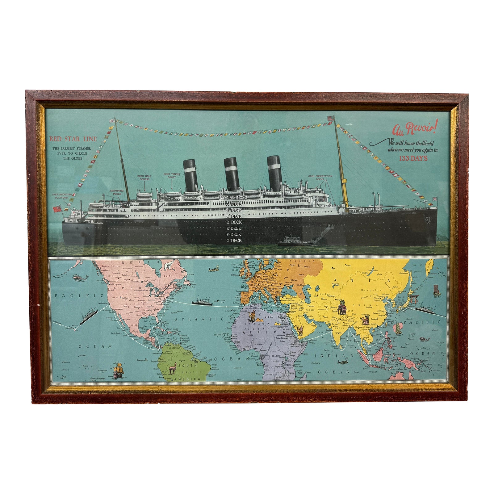 Design Plus Gallery presents a Vintage Red Star Line Poster. A stunning piece of nautical history. The bold text proudly proclaims the Red Star Line as the largest steamer ever to circle the globe, promising an unforgettable journey for any traveler. The striking contrast of the black and white steamer ship against the vibrant, colorful map of the globe creates a visually captivating design. The intricate route the ship will take is clearly displayed, showcasing the vast distances that will be covered on this epic voyage. This poster not only serves as a beautiful piece of art but also as a unique memento of a bygone era of luxury travel. Displayed in a custom frame, this poster would make a perfect addition to any nautical or vintage-inspired decor. In good vintage condition, minimal wear from use and age.