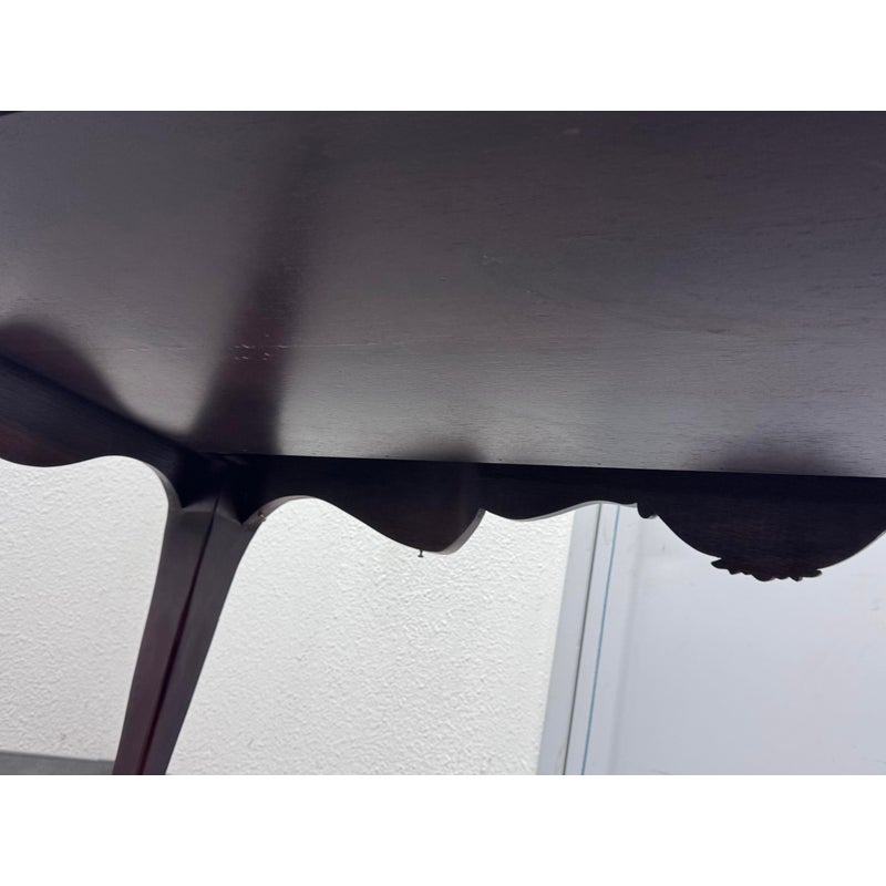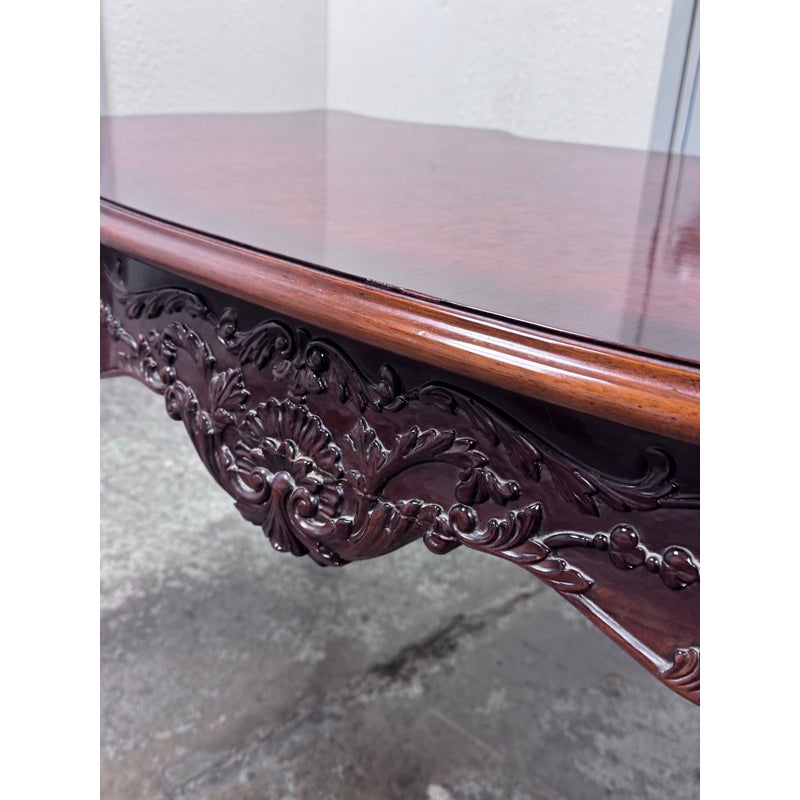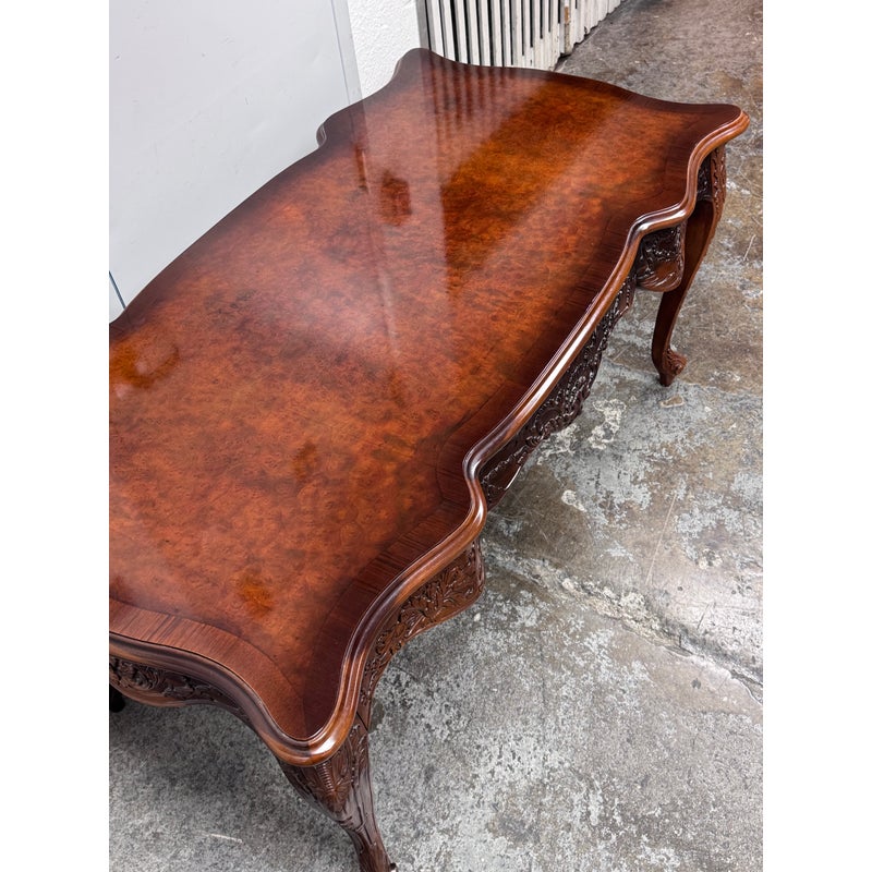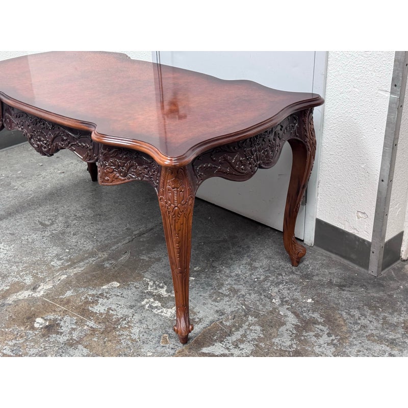 Design Plus Gallery presents a Renaissance Revival Desk. The desk is elegant with a curved shapes and sophisticated carvings. The desk houses three drawers, stands on cabriole legs, and and expansive work area all in an auburn stain to the wood. As a Renaissance Revival Rococo piece you will get a blend of grandeur with the lighthearted curves and natural ornamentation of 18th-century Rococo. The desk is in good overall condition for its usage.
