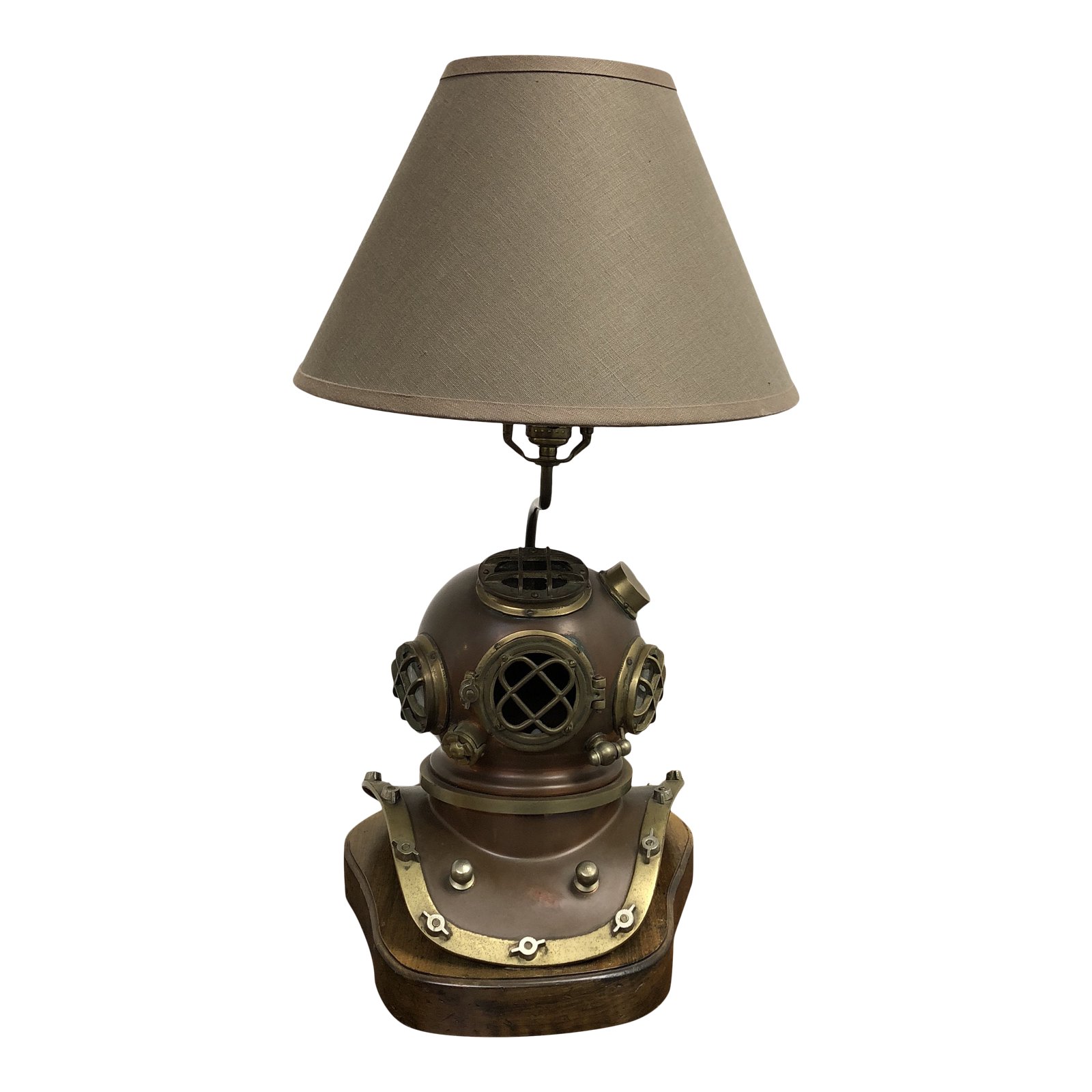 Design Plus Gallery presents a vintage unique table lamp. Bring in the deep sea diving into your decor. This is a vintage reproduction of a US Royal Navy antique divers helmet that was made for scuba diving in the deep sea. The helmet is metal in a bronze finish with soft gold accents. The front latch opens up to reveal a small inner bulb that lights inside of the helmet. The base is solid wood with a metal that forms around the helmet that holds a lamp shade. Two rubber tubes that resembles air tubes are connected to the helmet and wood base. The lamp shade is a soft dark linen grey cone shape, it can easily be replaced. This is a fun lighting addition for those ocean or steam punk design lovers.