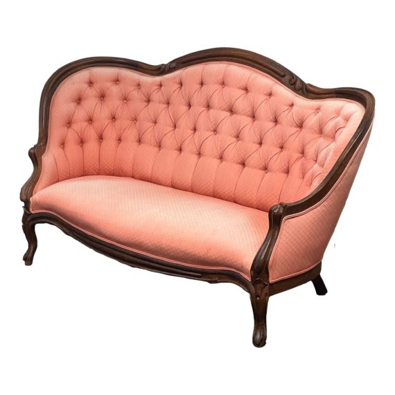 Design Plus Gallery presents a Rose Pink Victorian Eastlake Settee of Vintage Age. The frame has a high curved back that slopes down to the arm rests and has curvature in the front apron as well. The upholstery has a smooth handful with scale pattern to the design. The seat back is heavily tufted adding to its luxurious look and feel. Has sun fade condition that would be consistent with its vintage age + use. Would benefit with new upholstery.