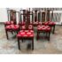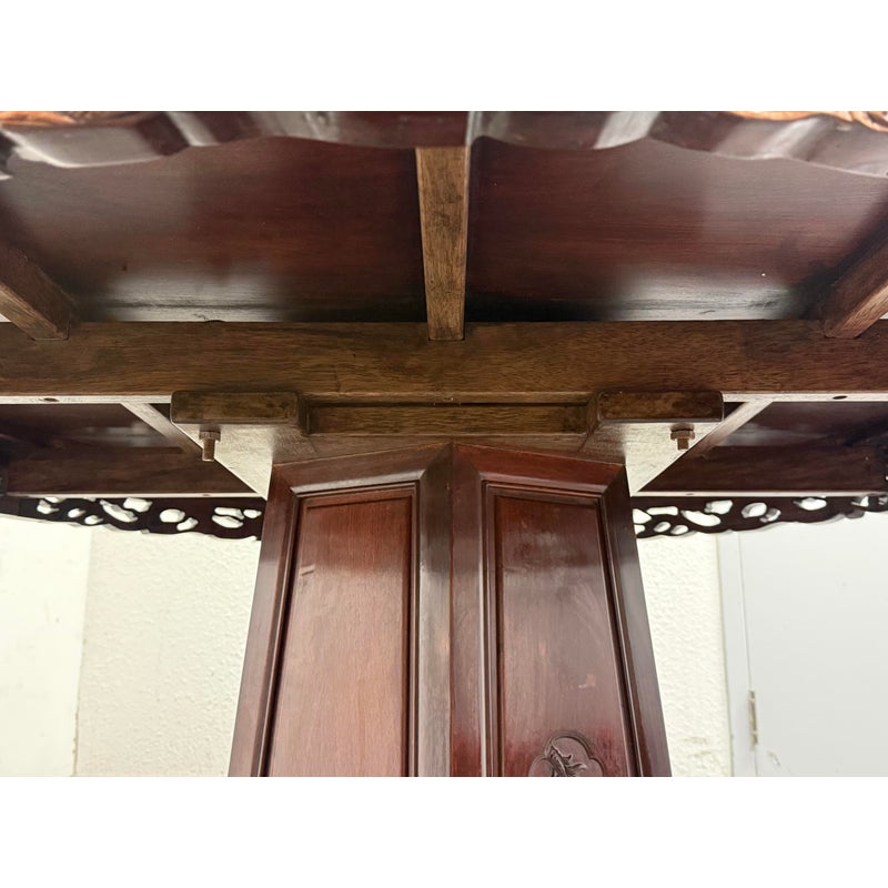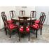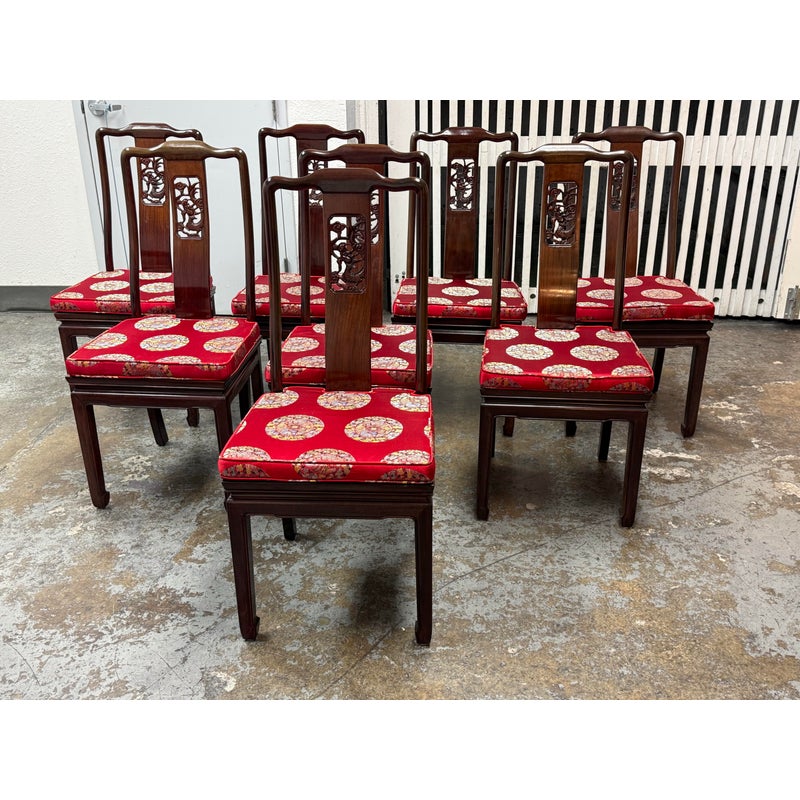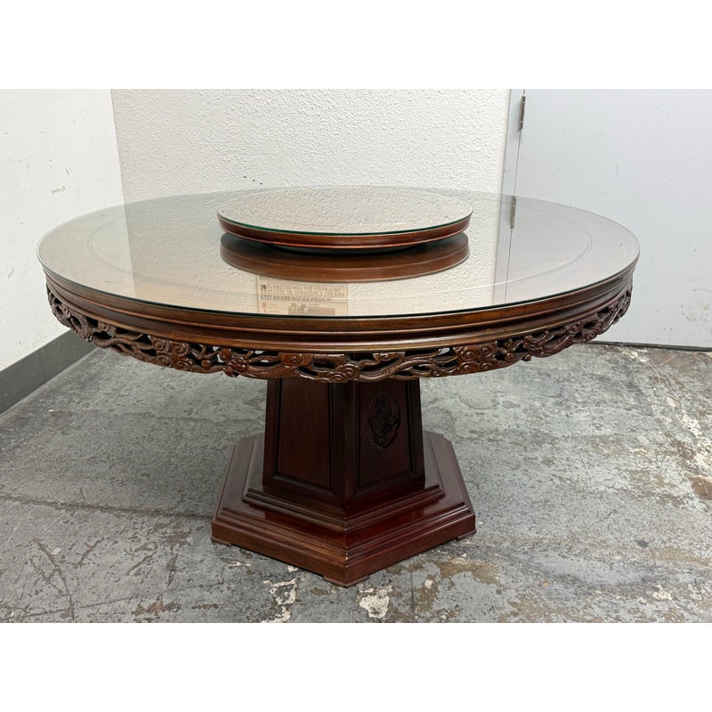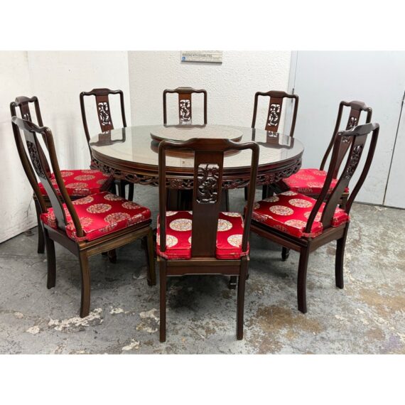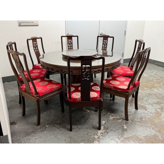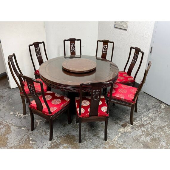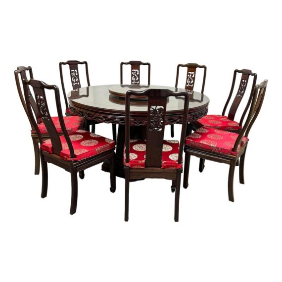 Design Plus Gallery presents a Vintage Chinese Round Dining Table + Eight Chairs Set. Crafted from solid rosewood, showcasing exceptional artistry and timeless design. The table features intricate hand-carved detailing throughout, highlighted by dragon motif carved into the apron, an enduring symbol of strength, prosperity, and good fortune in Chinese culture. The set includes eight matching chairs, each adorned with finely carved dragon designs on the backrests. The chairs are fitted with red silk-covered medallion cushions, adding a rich contrast and a touch of ceremonial elegance. At the center of the table sits a removable, glass-topped lazy Susan, offering both functionality and a refined finishing element ideal for shared dining.