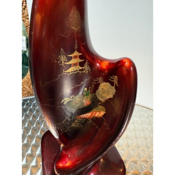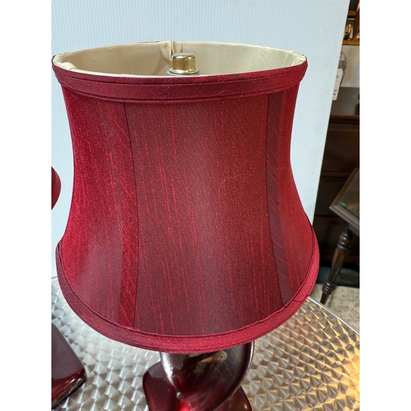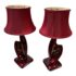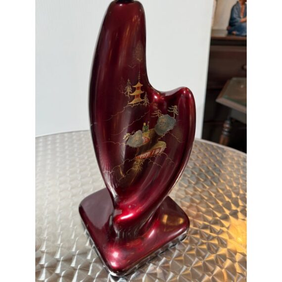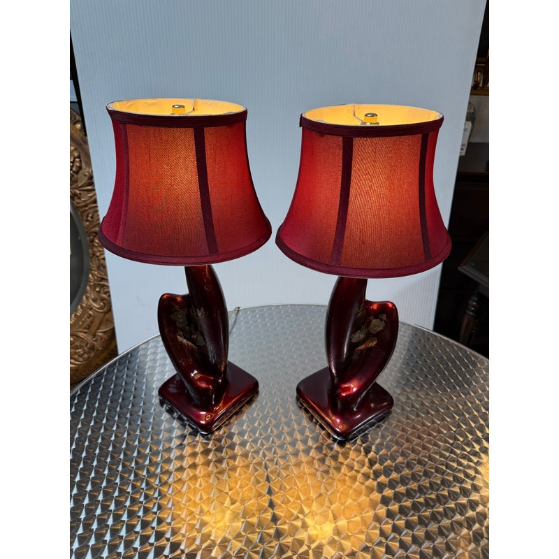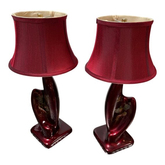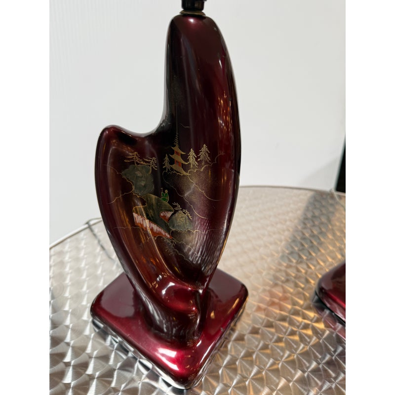 Design Plus Gallery presents a Pair of Vintage Ruby Toned Epoxy Table Lamps. The lamps epoxy gleams ruby red, with a matching tone of red shade for your monochromatic adoration within the sculpted figure of each of the lamps is a Japanese pagoda in an outdoor nature scene for your added splendor. Is in good condition for their likely vintage age + use.