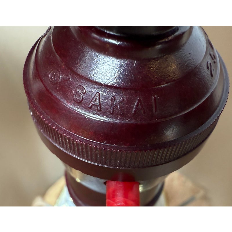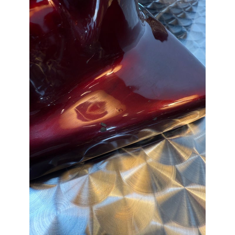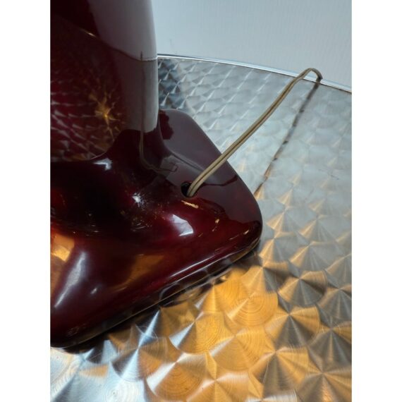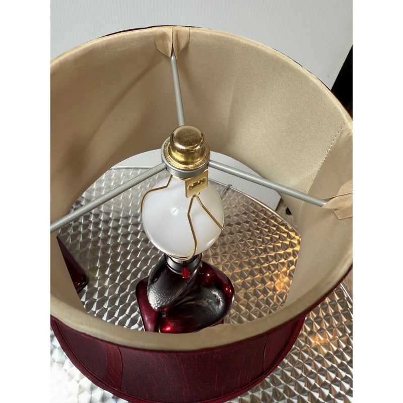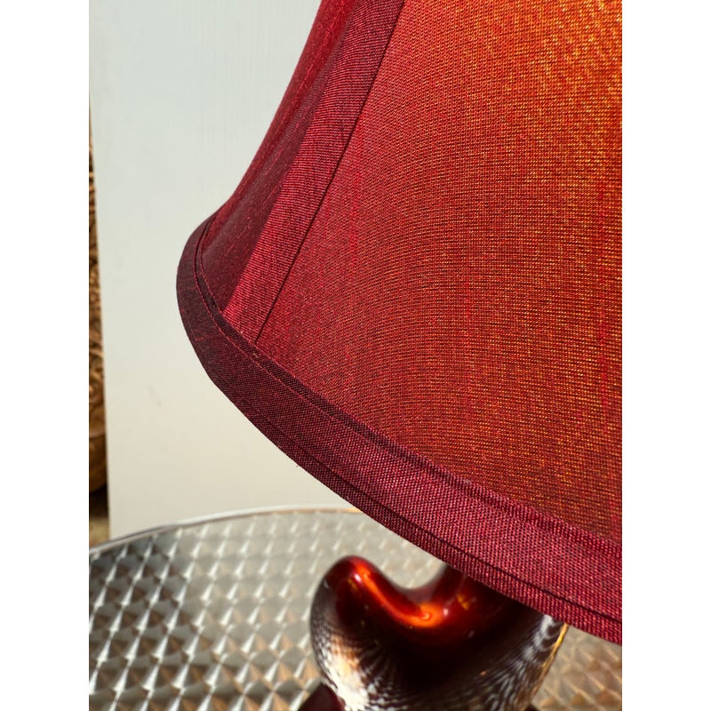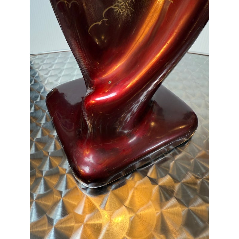 Design Plus Gallery presents a Pair of Vintage Ruby Toned Epoxy Table Lamps. The lamps epoxy gleams ruby red, with a matching tone of red shade for your monochromatic adoration within the sculpted figure of each of the lamps is a Japanese pagoda in an outdoor nature scene for your added splendor. Is in good condition for their likely vintage age + use.