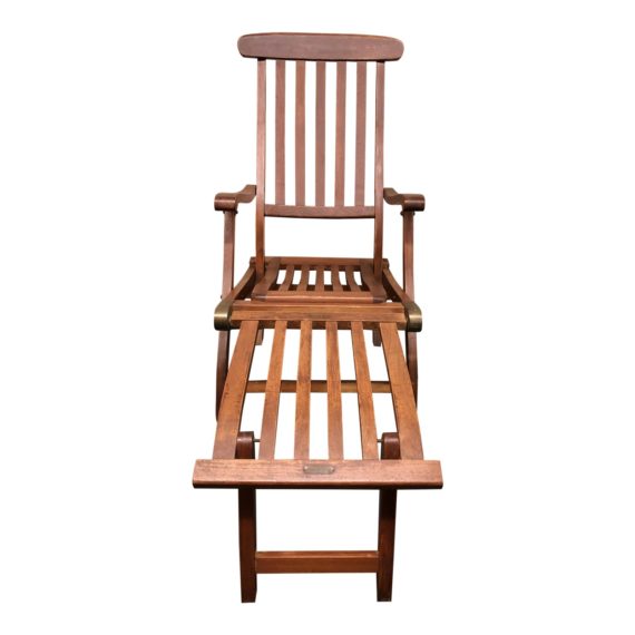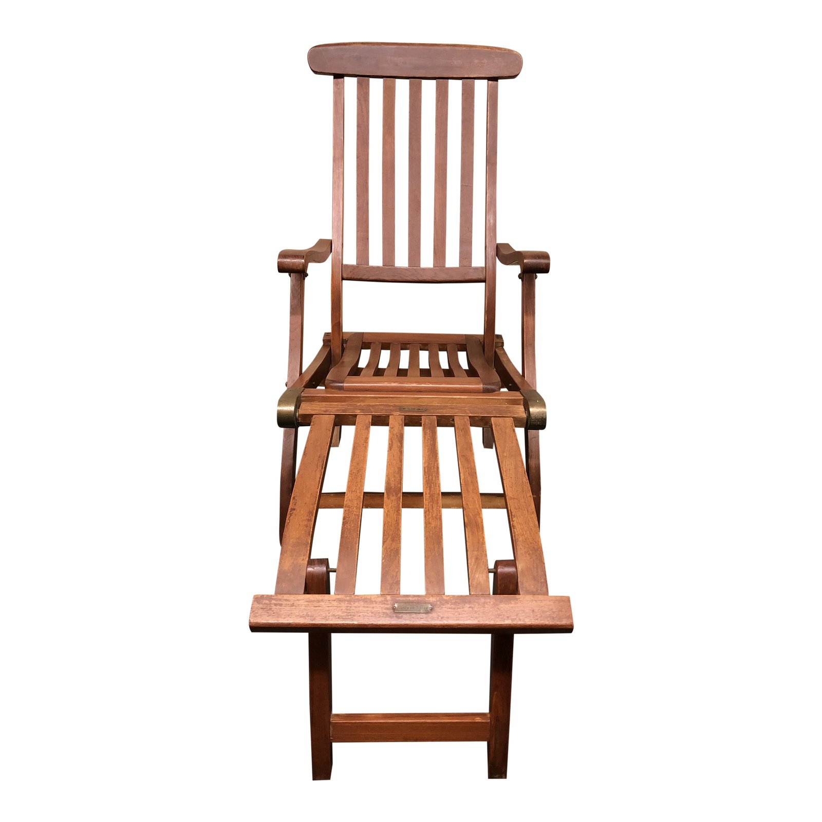 This is a vintage teak deck chair from the 1930s. The brass plate identifies the piece as being from the luxury ocean liner S.S. New Amsterdam. The first of 3 ships to carry the Amsterdam monkey, it continued in service from the late 1890s through the mid 1940s. It was the first of 3 ships of the Holland-American Line to bear the Amsterdam name, the third ship is currently in service. Second brass plate reads “1st Class Only.” Vintage patina.