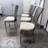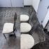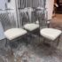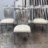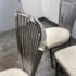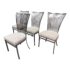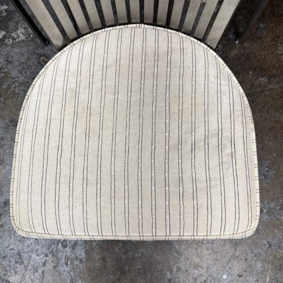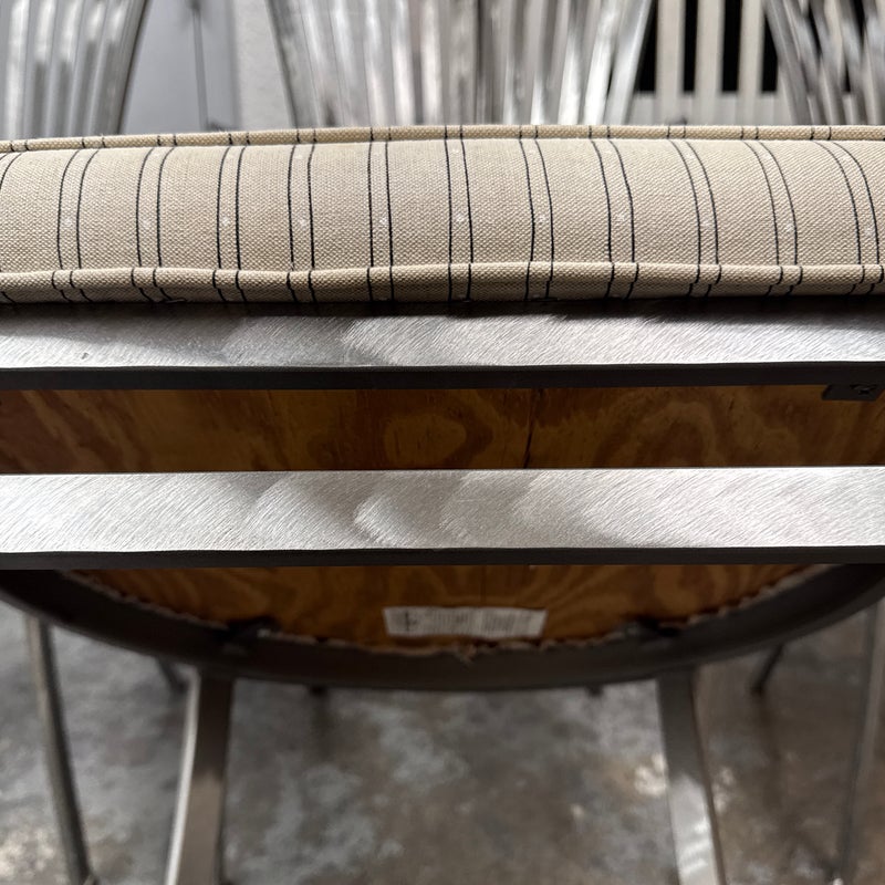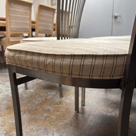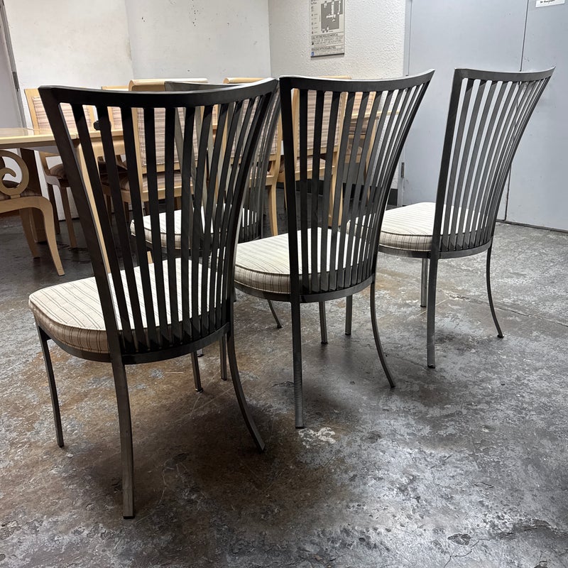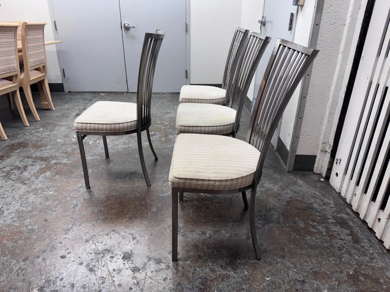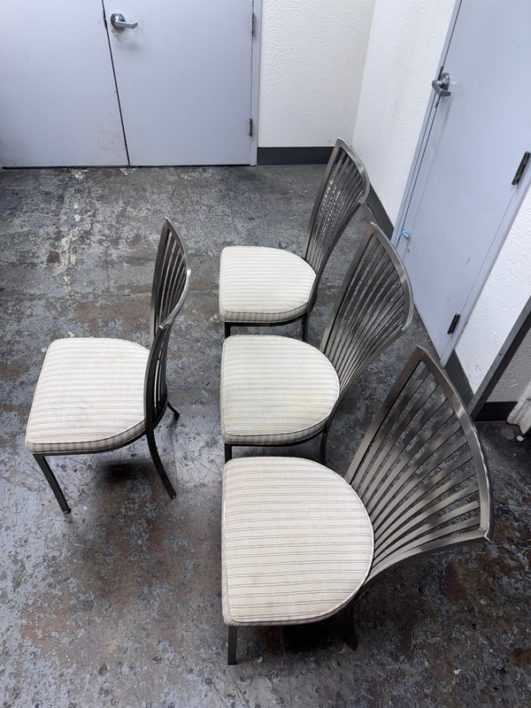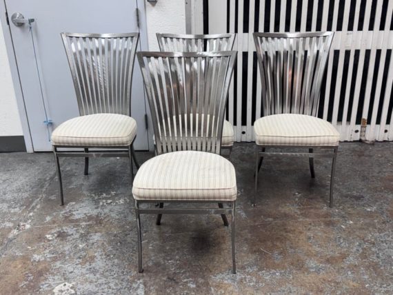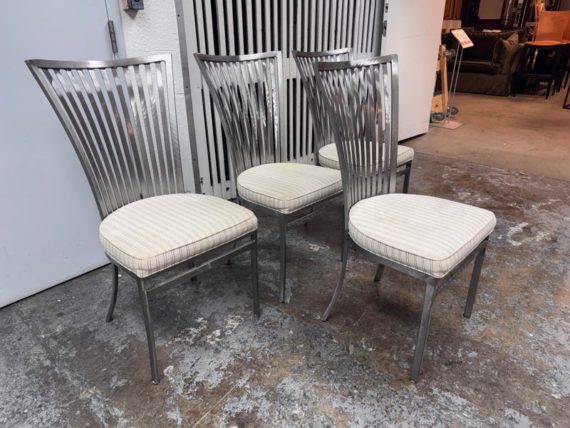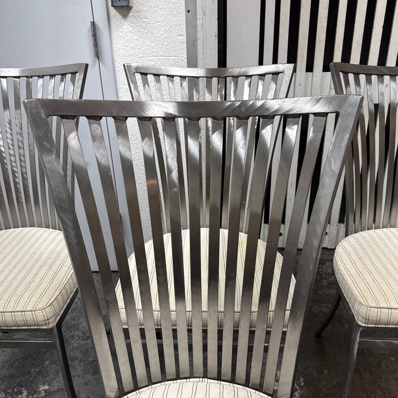 Design Plus Gallery presents a Set of Four Vintage Metal Dining Room Chairs from Shaver-Howard. The have a fanned back with metal slats, the entire of frame is of stainless steel. Each chair has a seat cushion of off-white with blue ticking stripe that would do well with professional cleanings. In good condition, visible and minimal wear. Cushiosn have staisn and would benefit with new upsholstery. Made in USA,