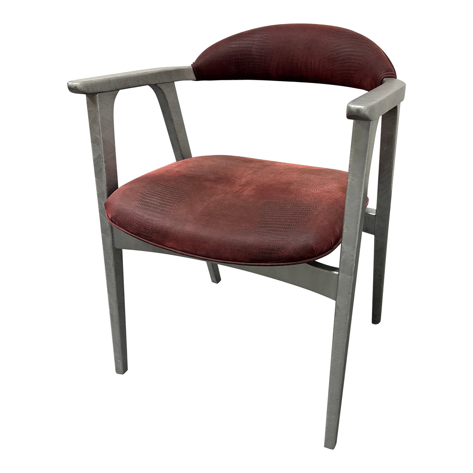 Design Plus gallery presents an Embossed Reptile Print Arm Chair of Post Modern Design. Seat and back rest are done in an incredible upholstery with a brushed silver wood frame. Strong, sturdy and unique! Is in good condition with minimal signs of wear.