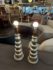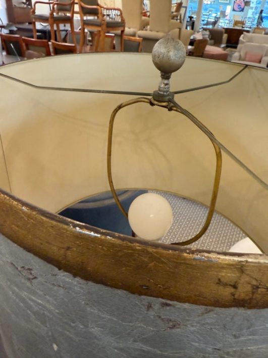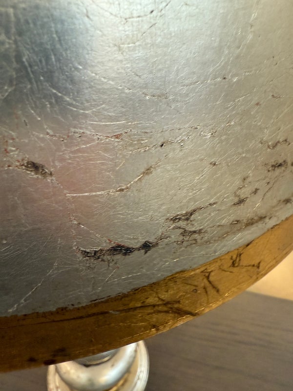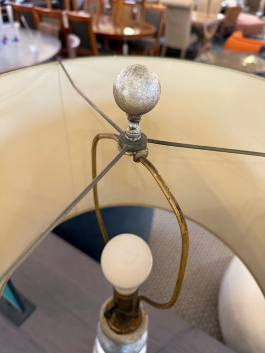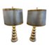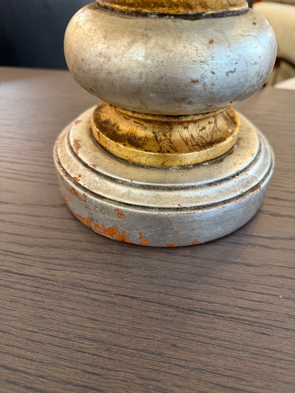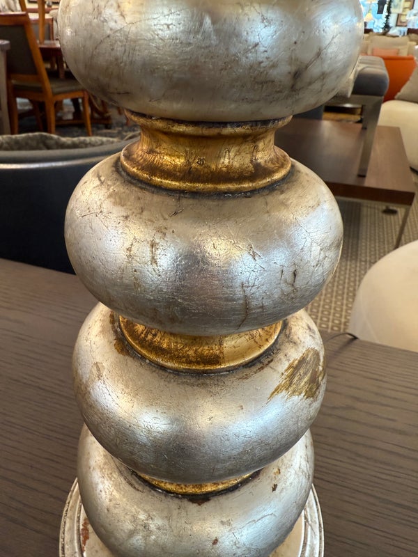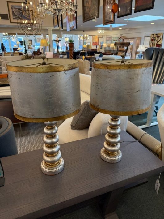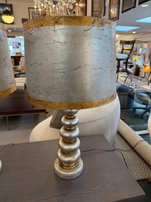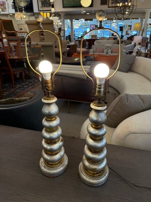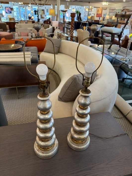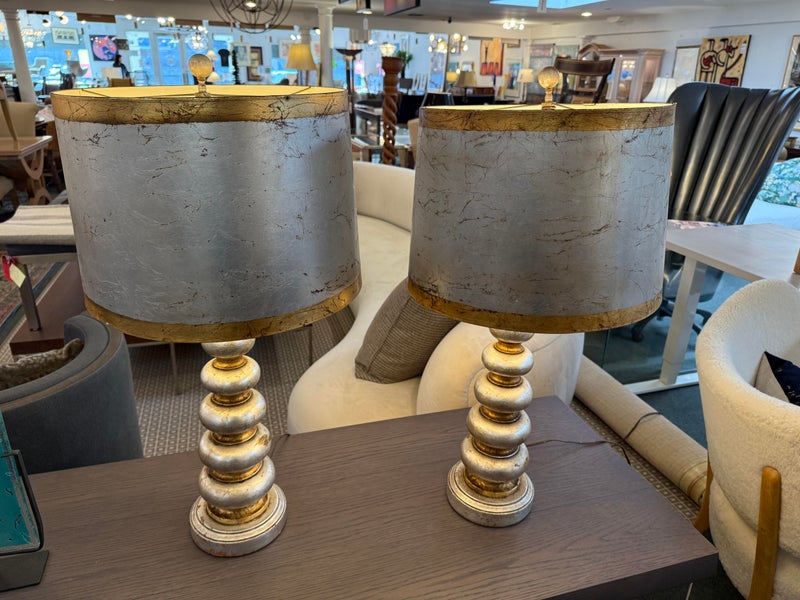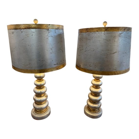 Design Plus Gallery presents a Pair of Vintage Silvered Table Lamps, designed after James Mont. Known for his elaborate designs and fine finishes, Mont straddled the overlapping worlds of Art Deco, Hollywood Regency, and Midcentury Modern. This pair references a similar stacked wood design combining both silver and gold finishes on both lamps and matching shades. Light surface wear; different plug styles; condition is consistent with age and use.