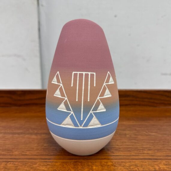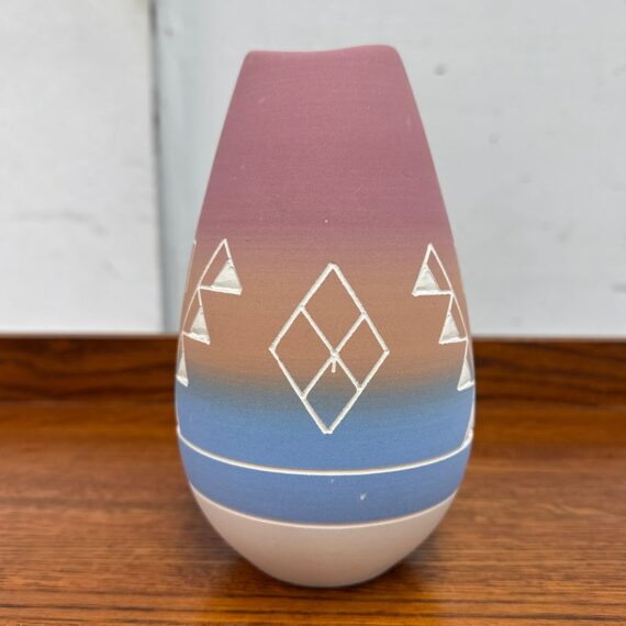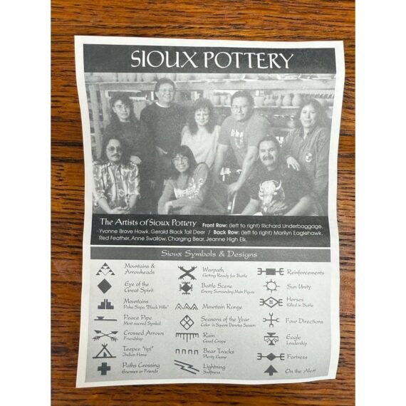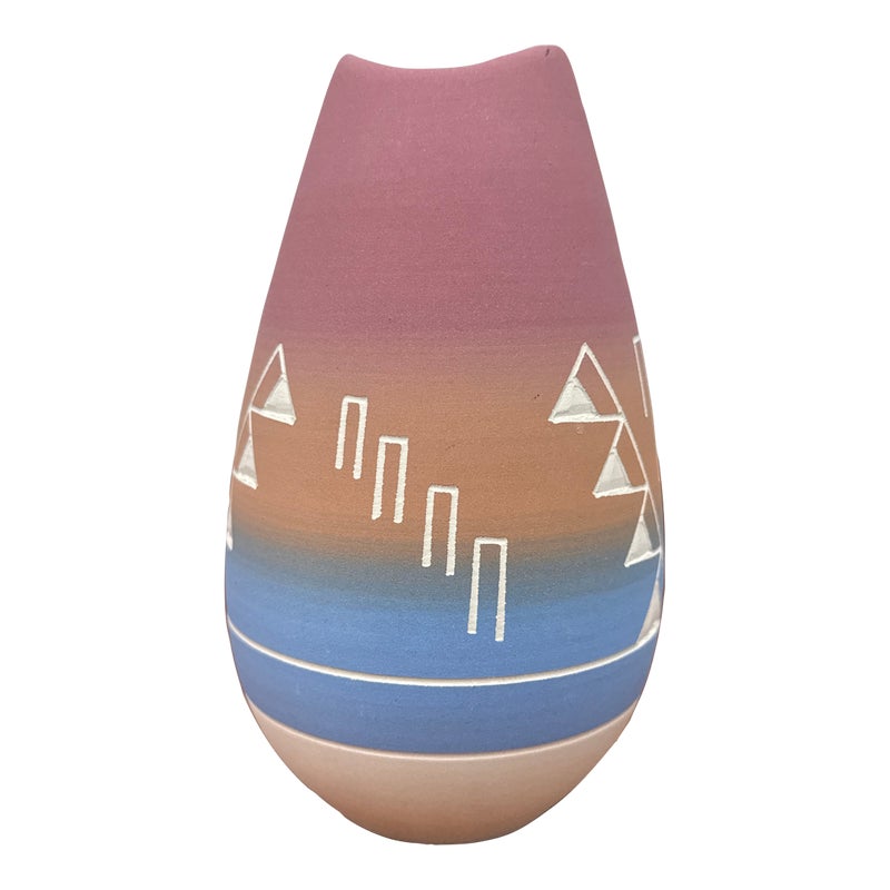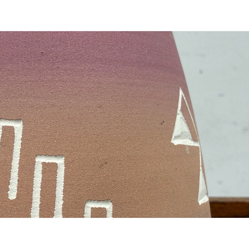 Design Plus Gallery presents a Vintage Hand Crafted Vase from Sioux Pottery. Multiple symbols each symbolizes a meanings ranging from seasons to landscapes. In good condition, signed underneath. Made in USA.
