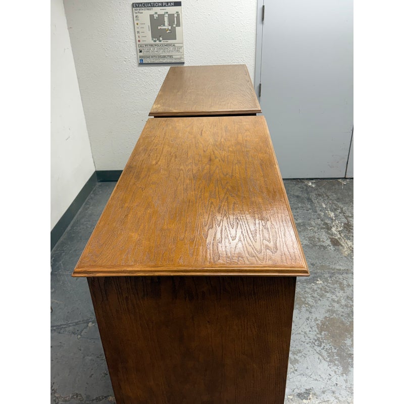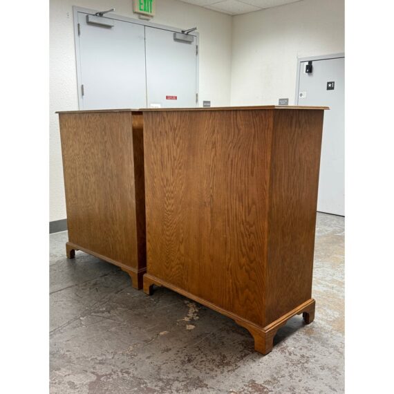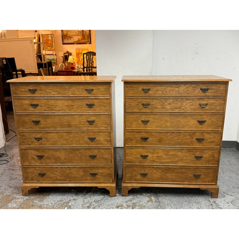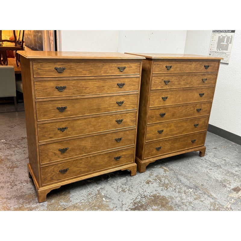 Design Plus Gallery presents a Pair of Dressers with American Oak Wood Veneer + Six Drawers Each. All original with aged iron handles and equal sized drawers, these identical dressers will anchor your bedroom effortlessly and be a great storage source for all your soft items. They are in good condition with minimal surface wear for their usage.