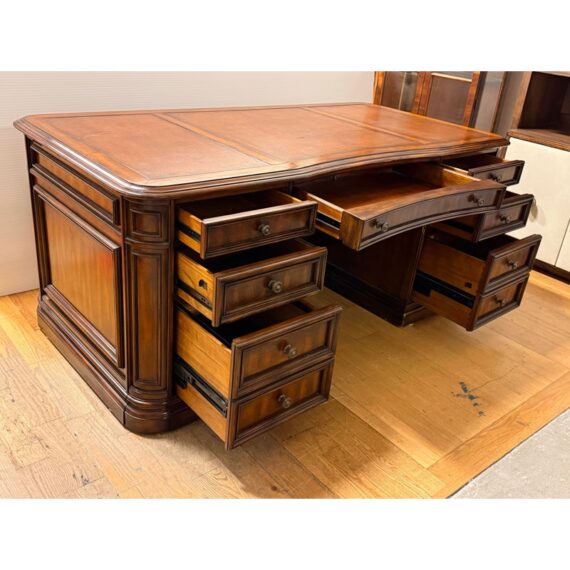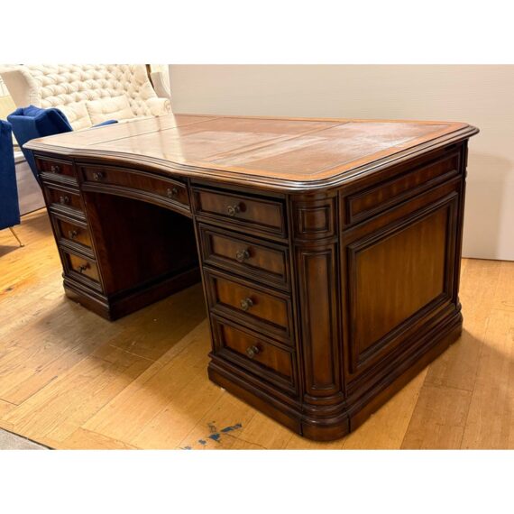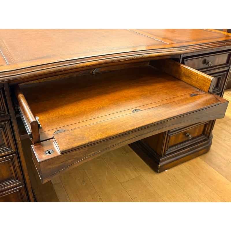 Design Plus Gallery presents an Executive Desk from Sligh Furniture. A timeless example of American craftsmanship, combining refined design with everyday functionality. Crafted from solid woods and veneers, the desk features a classic, substantial silhouette suited for a home office or executive setting. The desk offers generous storage with four drawers on each side, along with a center drawer featuring a drop-down front, ideal for use as a keyboard or writing surface. The work surface is finished with a leather inset top. The wood finish shows visible distress, lending character and warmth, while minimal surface wear is present and consistent with normal use. The desk remains in good overall condition and includes its original key. In good vintage condition, visible and minimal wear from usage. Made in Grand Rapids, Michigan, USA.