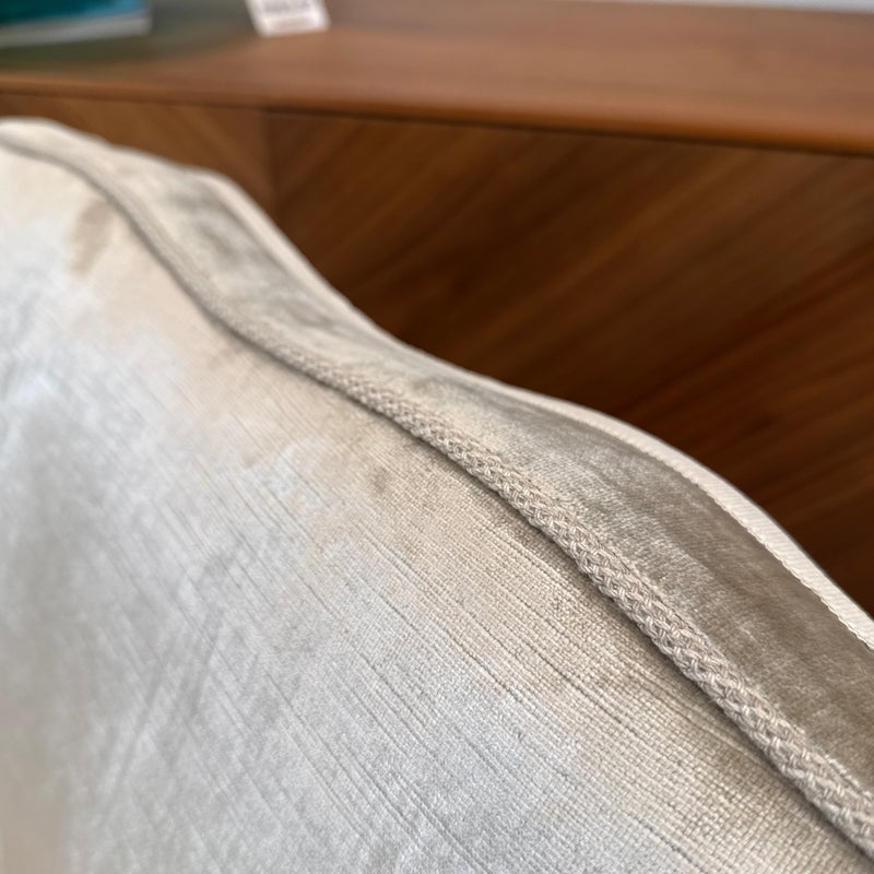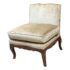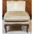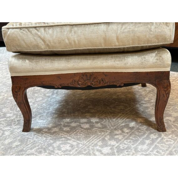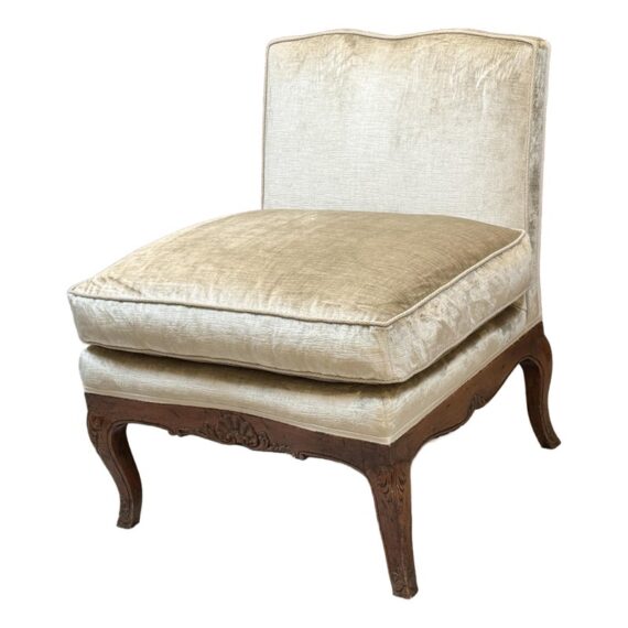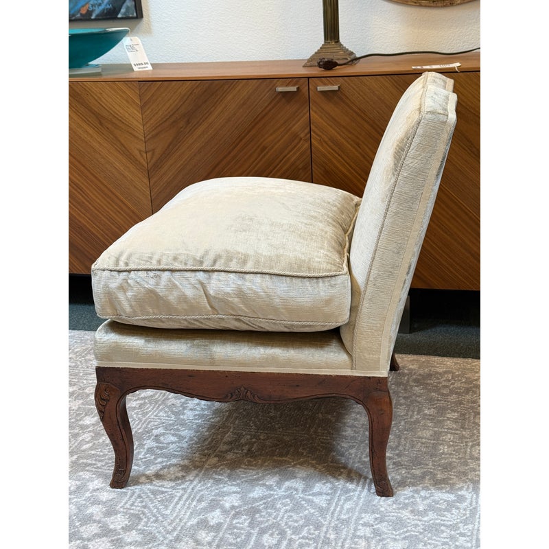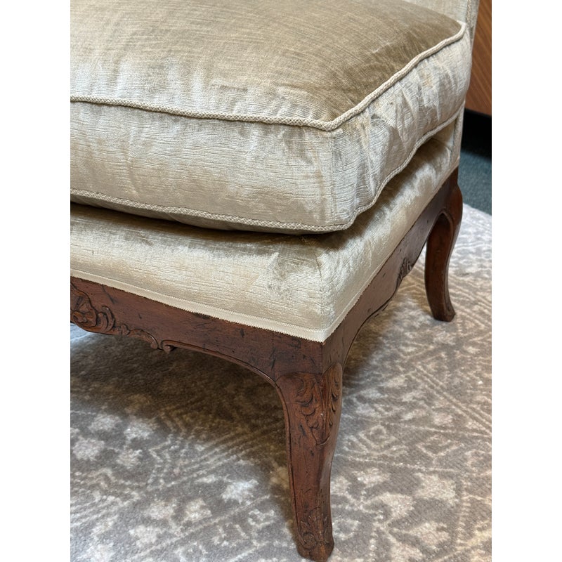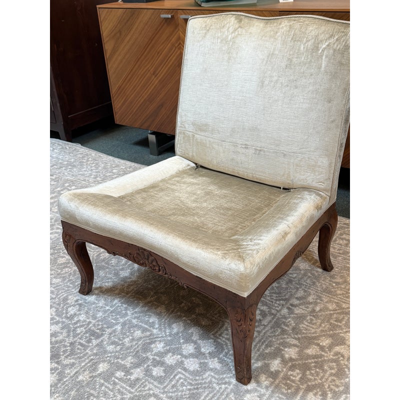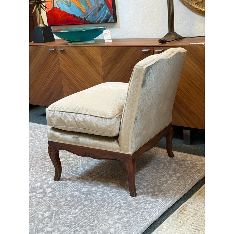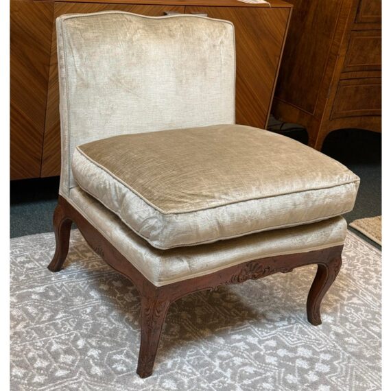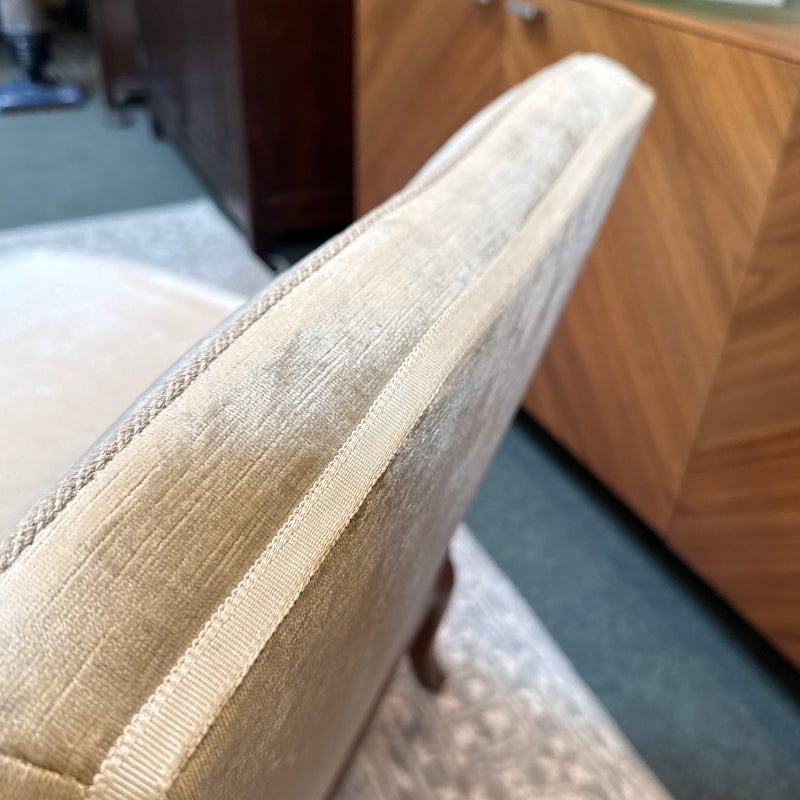 Design Plus Gallery presents a Vintage Slipper Chair. The chair rests on a hand-carved wood base, detailed with cabriole legs that softly curve outward—a hallmark of vintage French-inspired styling. The seat features a plush, loose cushion for comfort, inviting you to sink in and relax. Its tight back showcases a distinctive mustache-shaped silhouette, lending a touch of playful sophistication and visual interest. Upholstered in a champagne-beige velvet with a subtle gleam, the fabric catches the light to give the piece a hint of glamor while maintaining an understated allure. A perfect blend of old-world charm and present-day appeal, this slipper chair is a versatile accent—ideal for bedrooms, living rooms, or any setting that calls for a graceful, comfortable seat with enduring style. In good condition, visible and minimal wear from usage.