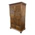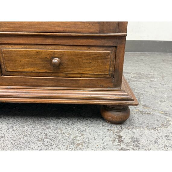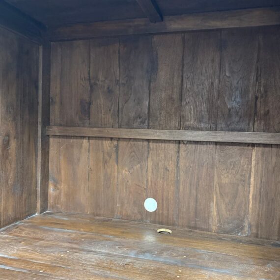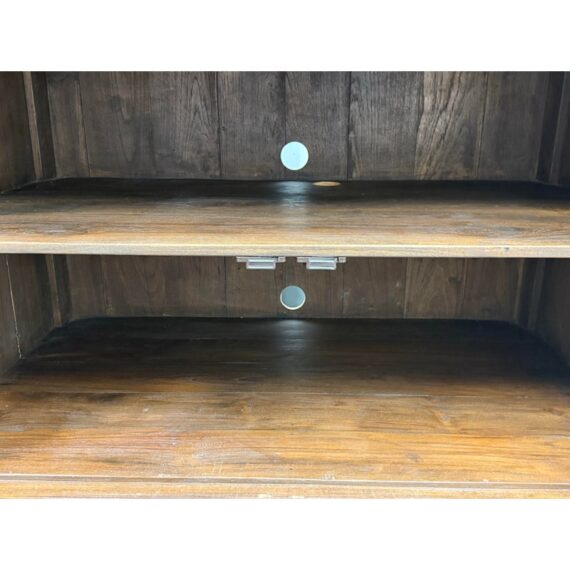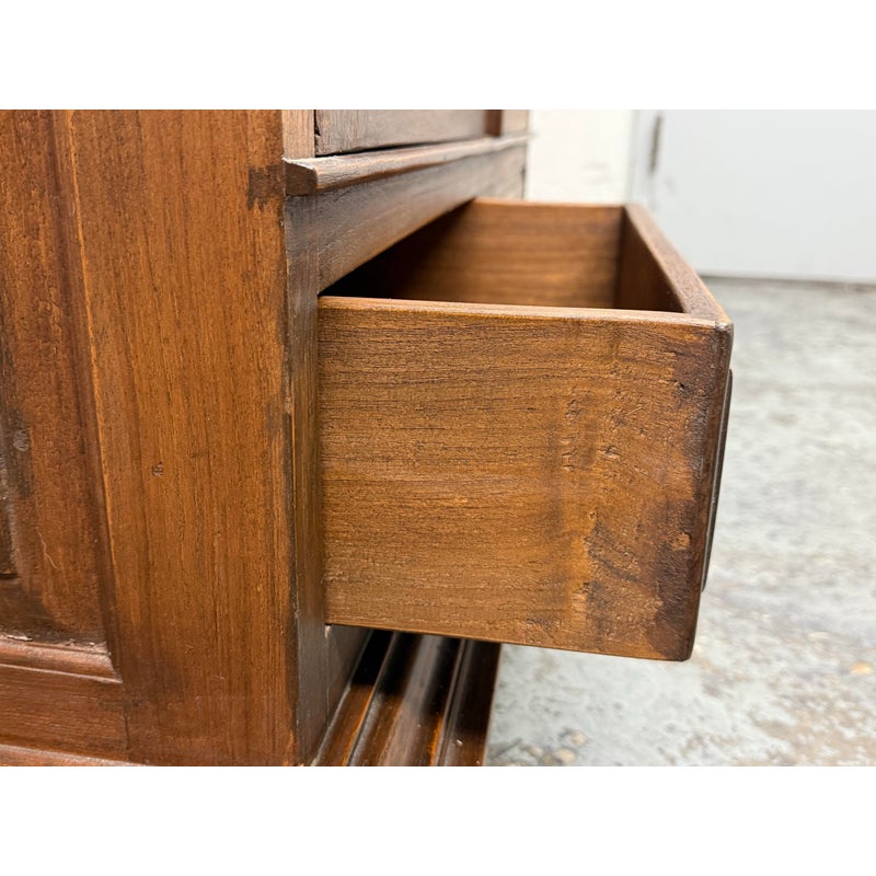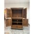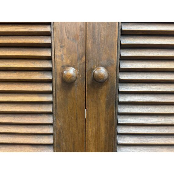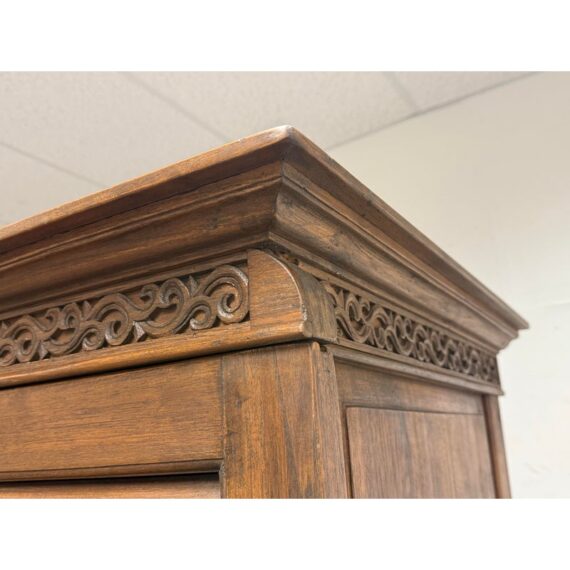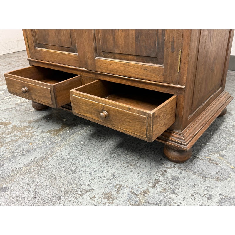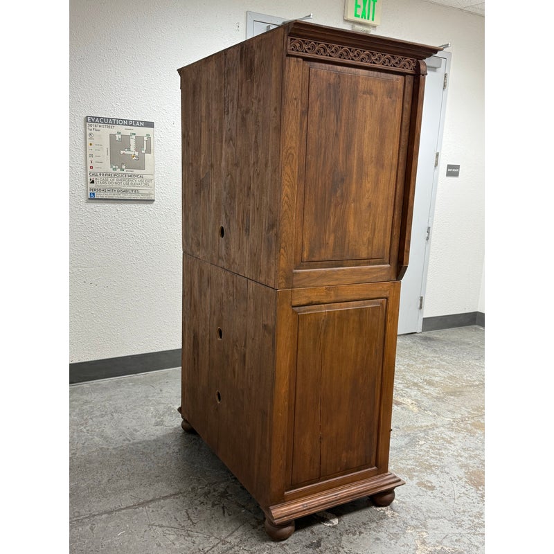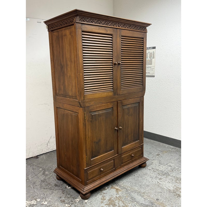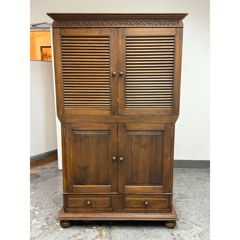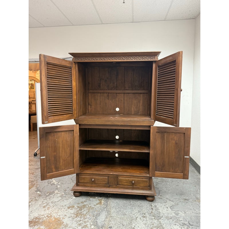 Design Plus Gallery presents a Teak Wood Armoire of Vintage Age. The two piece cabinet is a blend of island style with contemporary sophistication. Its upper portion houses an open cavity ideally for tucking away electronics. The doors on top and bottom stacking units are shuttered and give off a tropical style similar to Tommy Bahama furnishings. The cabinet doors are the base have shelving inset and there are two half width drawers, all resting upon shaped bun feet. The cabinet also has openings in both units for cord management. Overall the armoire is in good condition for its overall age + use.