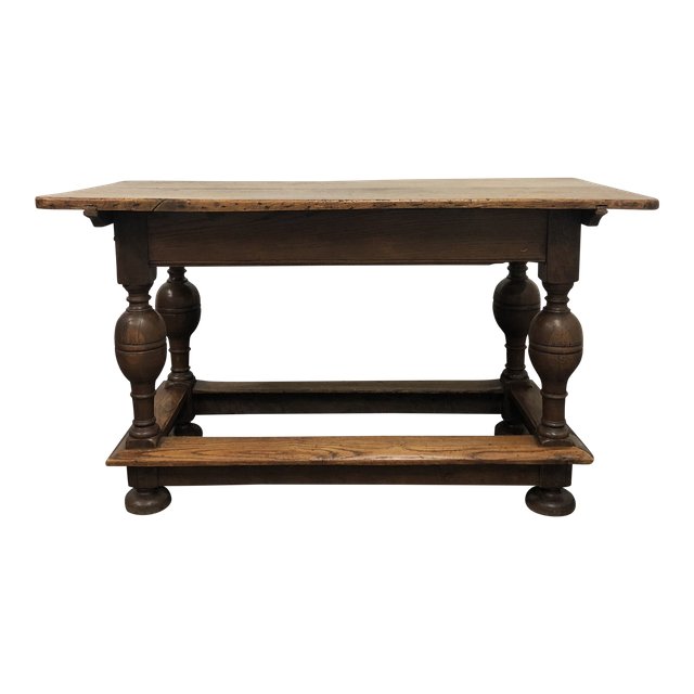 Design Plus Gallery presents a vintage Spanish wood console table. The four legs are joined together with a wood frame at the base. The rustic wear and varnish of this simple table screams European farm house. Tiny details such as evidence of joinery techniques elevate the simple beauty of this aged and elegant import.