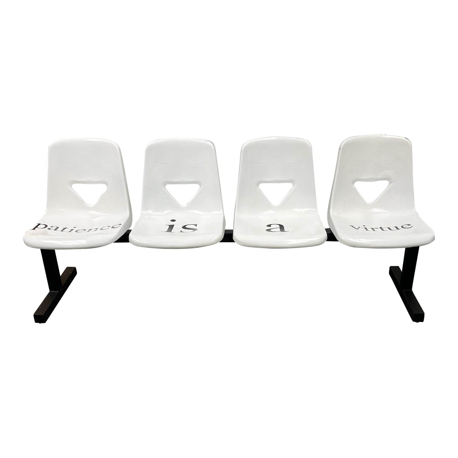 Design Plus Gallery presents a Vintage Set of Four Attached Stadium Seats, each crafted of white-painted metal for an industrial-chic look. These four attached seats feature a unique wordplay design, with each seat having a word etched into it to spell out the phrase, “Patience Is a Virtue.” The seat backs are slightly angled, featuring a triangle cutout. These stadium seats are perfect for adding a touch of modern style to any space., The black powder-coated frame has a few splatters of white paint, otherwise good condition. Visible and mine wear from usage + age.