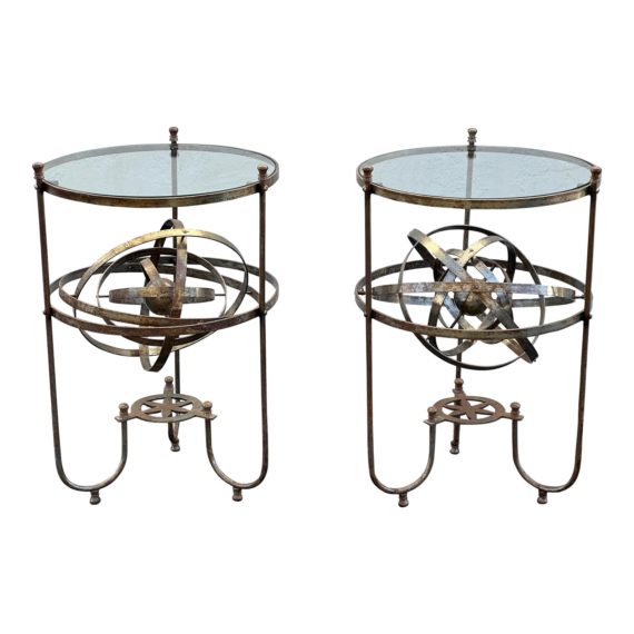 Vintage Steel + Glass Armillary Sphere Occasional Tables, a Pair