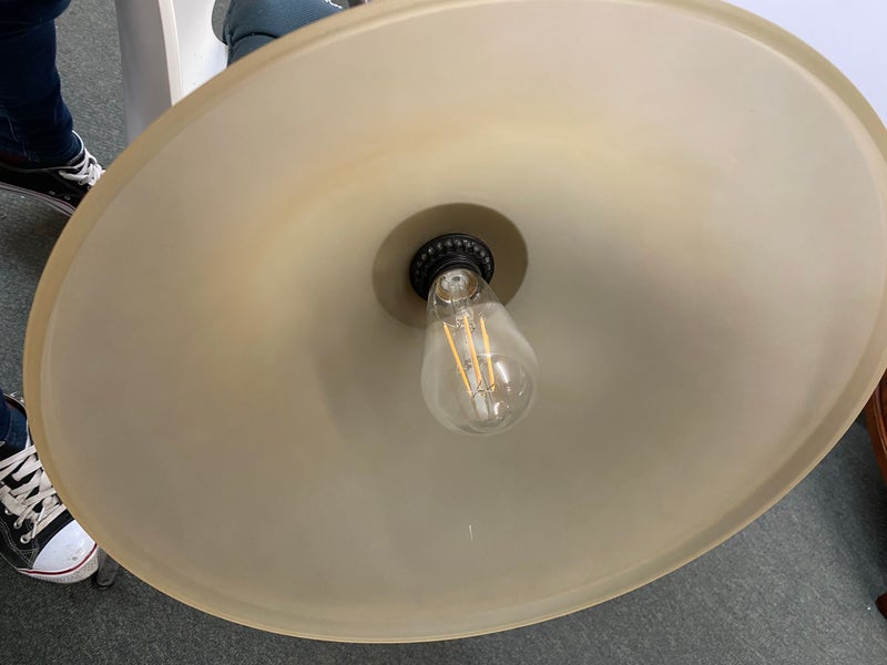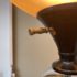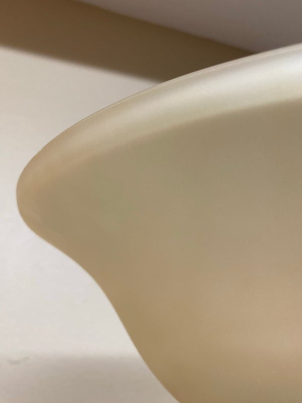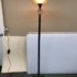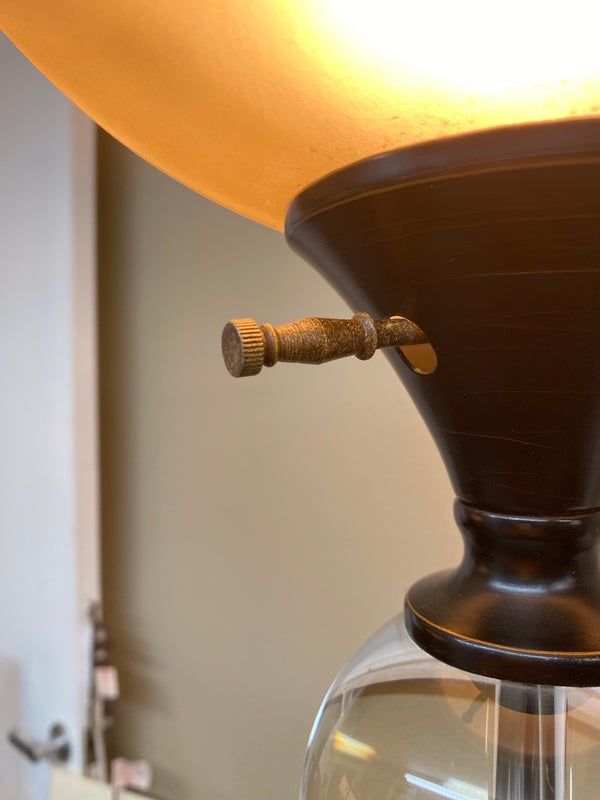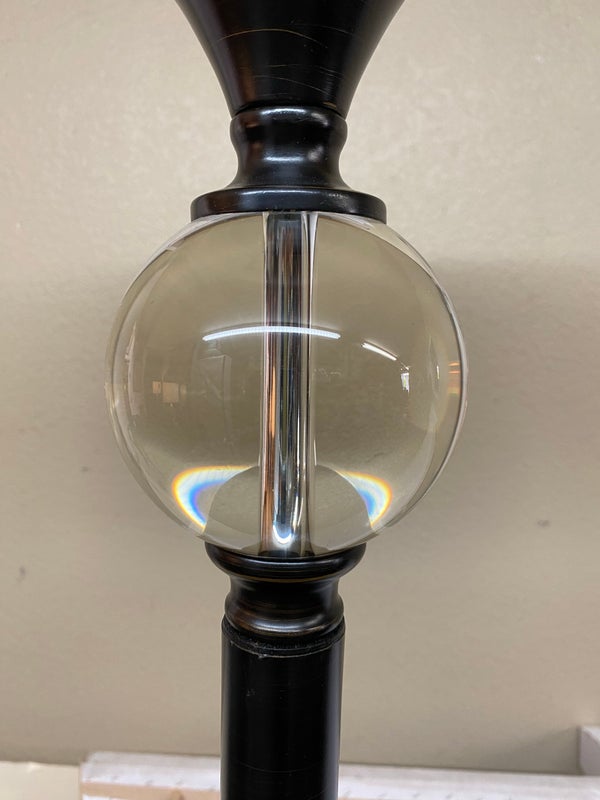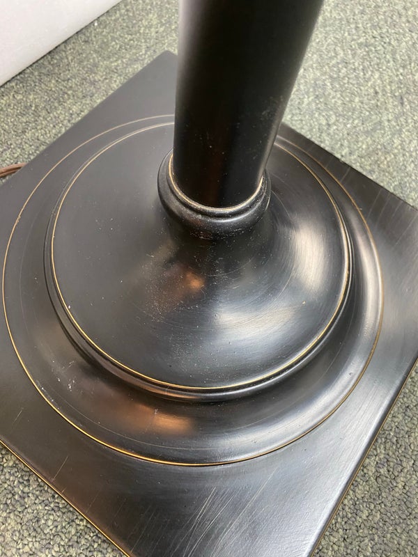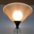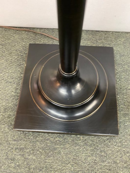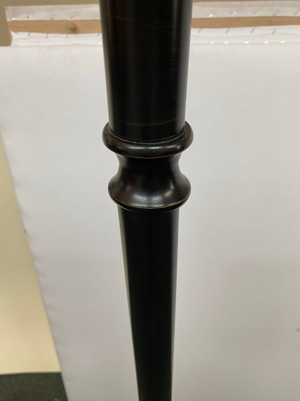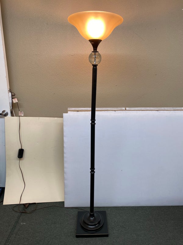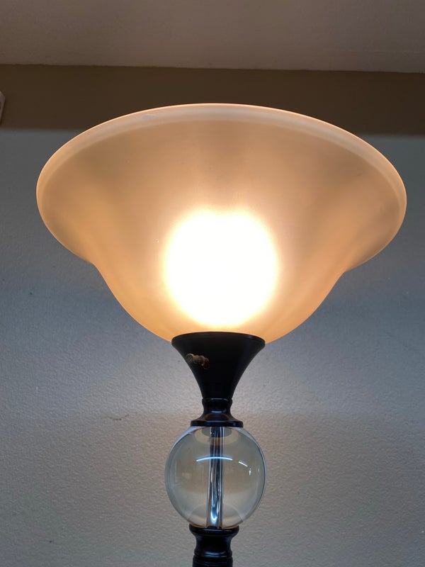 Design Plus Gallery presents a Vintage Style Torchiere Lamp. Simplified classic details include the frosted flared shade, glass orb that tops the spun metal bronze-finished column and beveled bronze base. Switch on column and on cord, for convenience. Light surface wear; condition is consistent with age and. use.