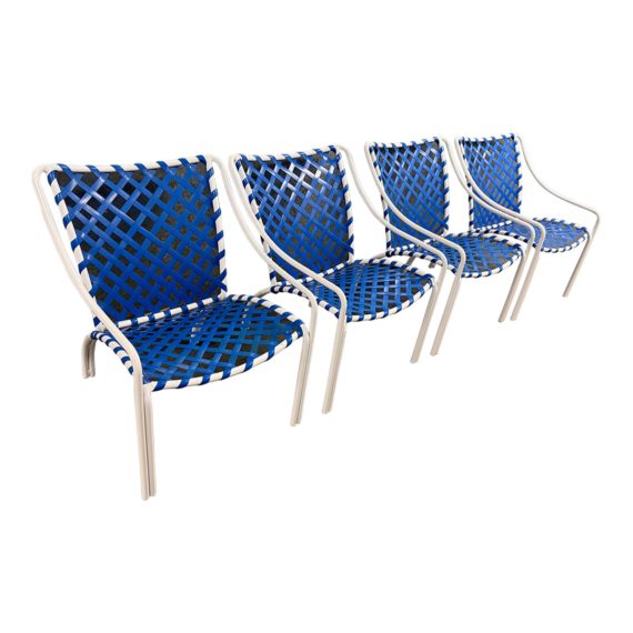 Design Plus Gallery presents a Set of Four Tamiami Bright Cobalt Blue & White Outdoor Chairs from Brown Jordan. Tamiami chairs have a worn plastic seat and back with a powder coated white aluminum frame. They are vintage, lightweight and the perfect component pool or lakeside. They have visible, minor wear due to their age + use.