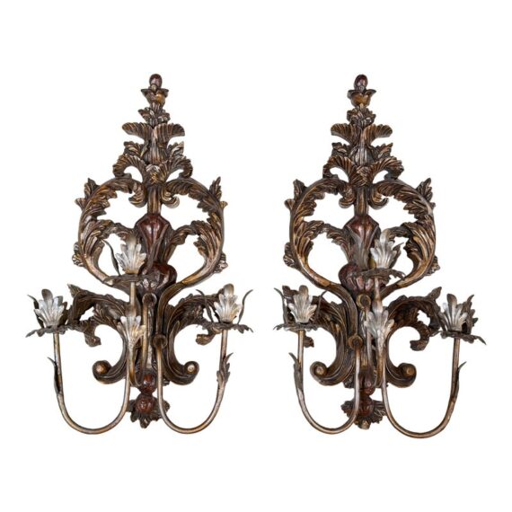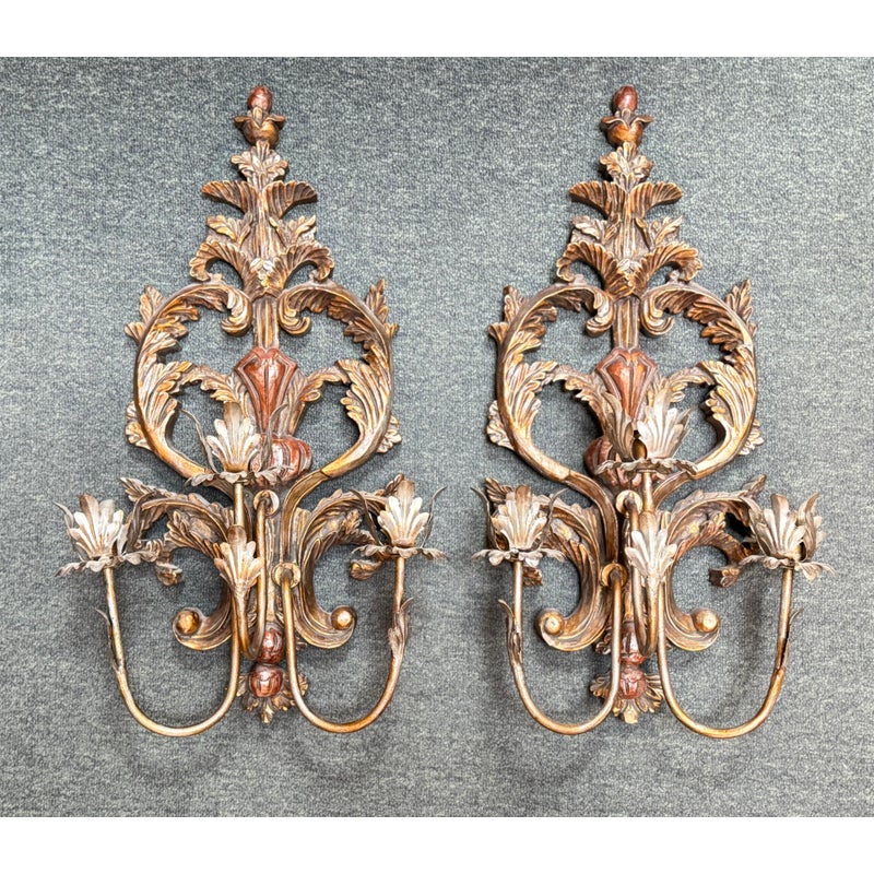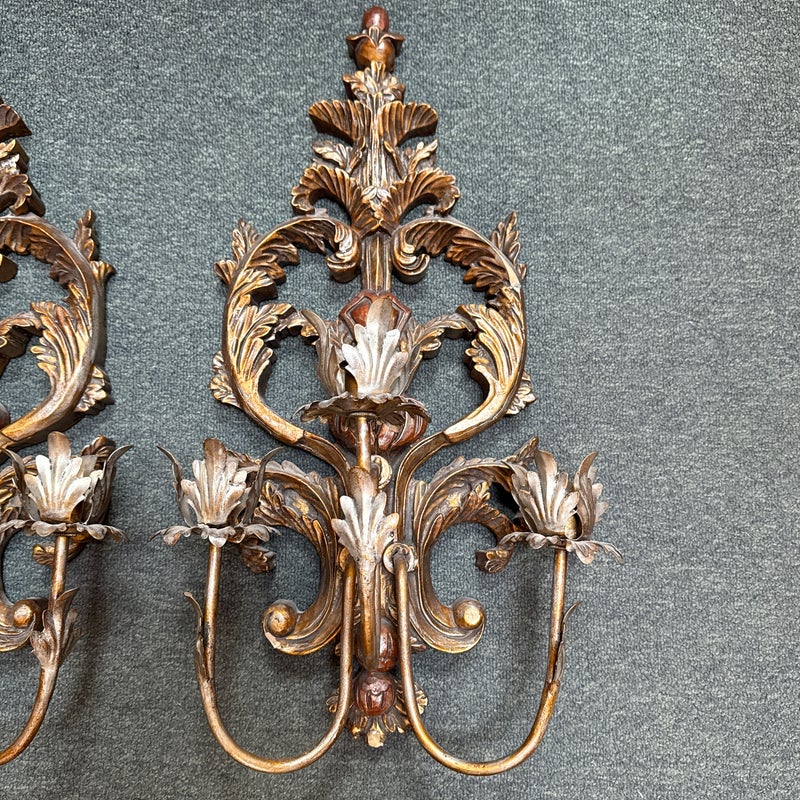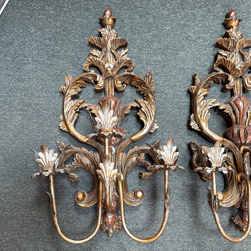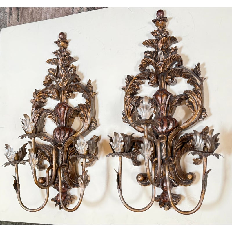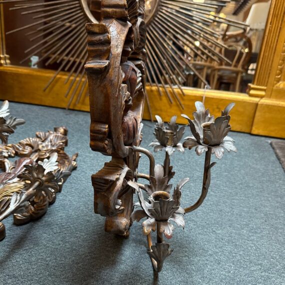 Design Plus Gallery presents a Pair of Antique Style Wall Sconces. Not electrified, the pair has metal arms to support wax or battery-operated candles to throw ambient light in your space. Casting allows for beautiful, realistic bronze details in leaves and flourishes. Visible and Light surface wear; one has a crack; condition is fair for age and use.
