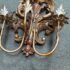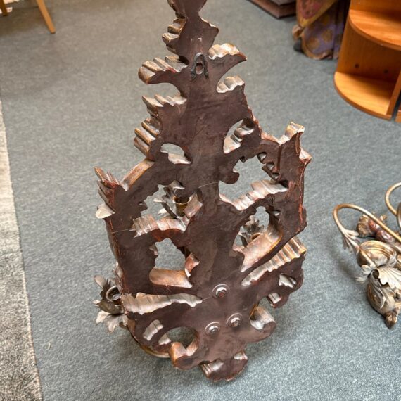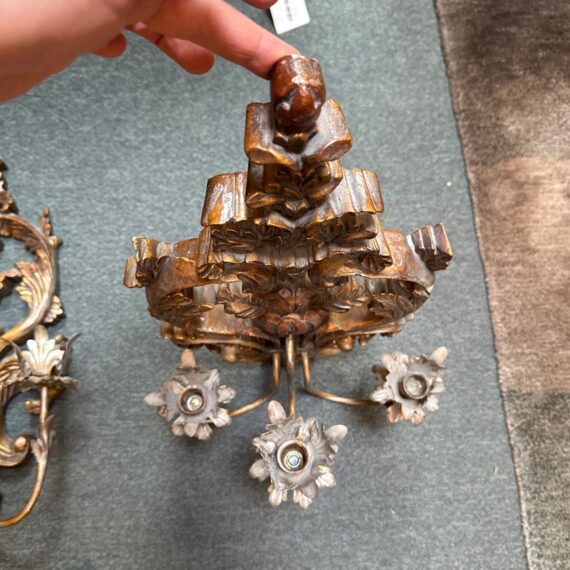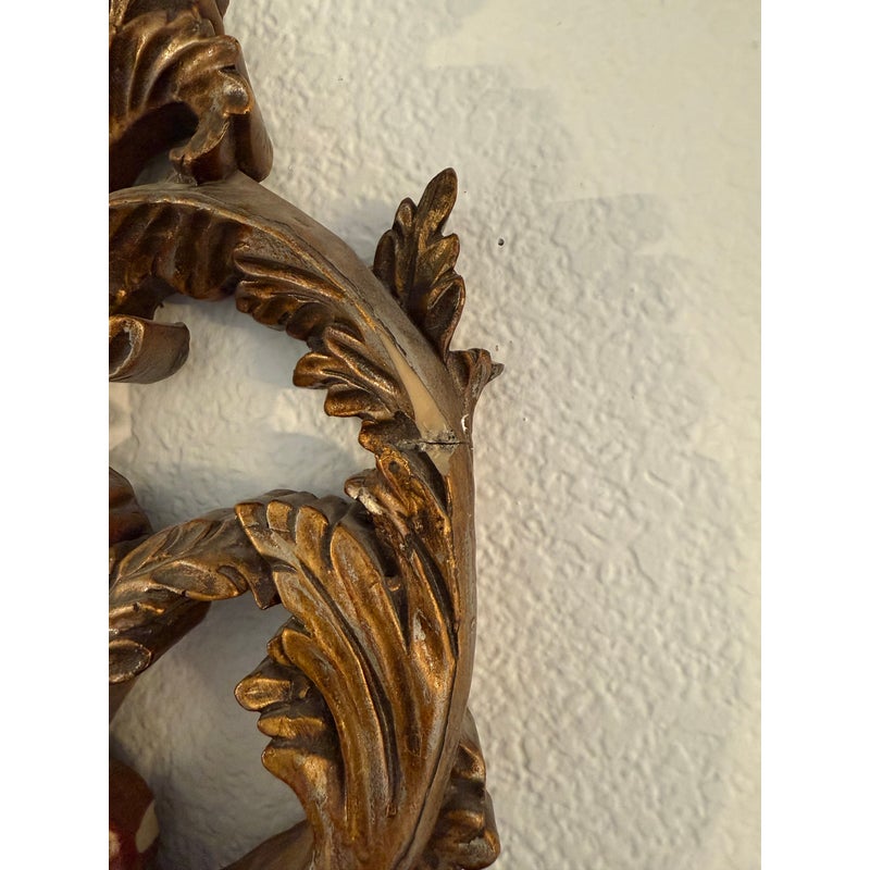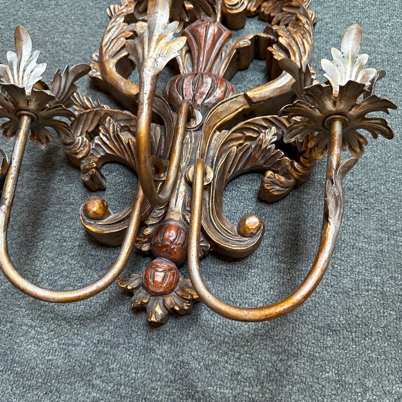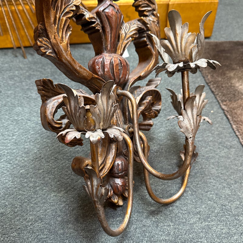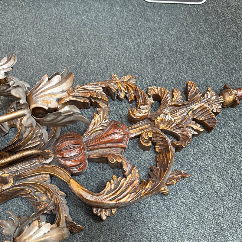 Design Plus Gallery presents a Pair of Antique Style Wall Sconces. Not electrified, the pair has metal arms to support wax or battery-operated candles to throw ambient light in your space. Casting allows for beautiful, realistic bronze details in leaves and flourishes. Visible and Light surface wear; one has a crack; condition is fair for age and use.